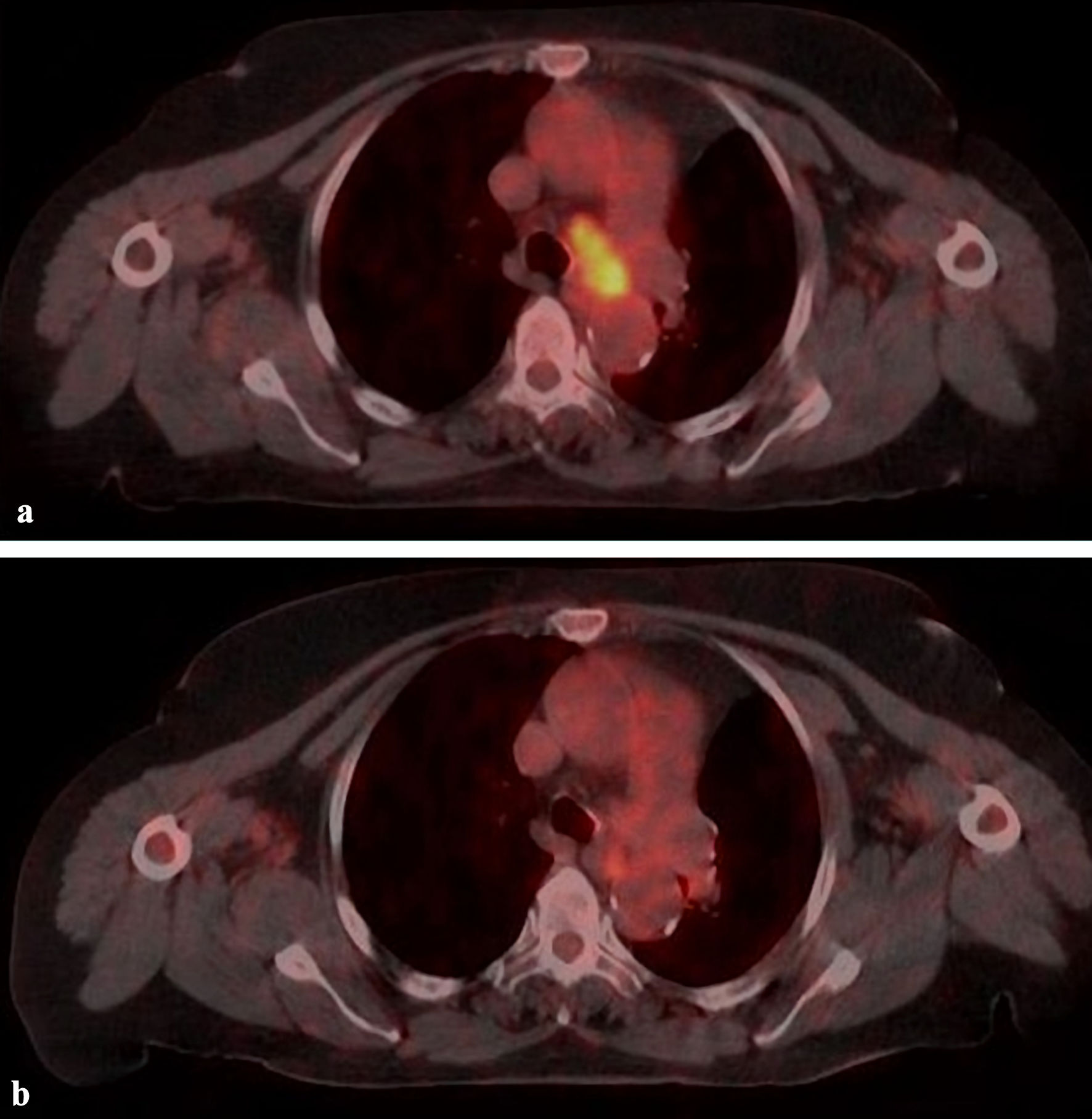 ![]() Click for large image | Figure 2. A case with lymph node (4L) metastasis treated with 39 Gy/6 fx. (a) PET/CT image before treatment. (b) Complete response with PET/CT at 4 months after treatment. PET/CT: positron emission tomography/computed tomography. |