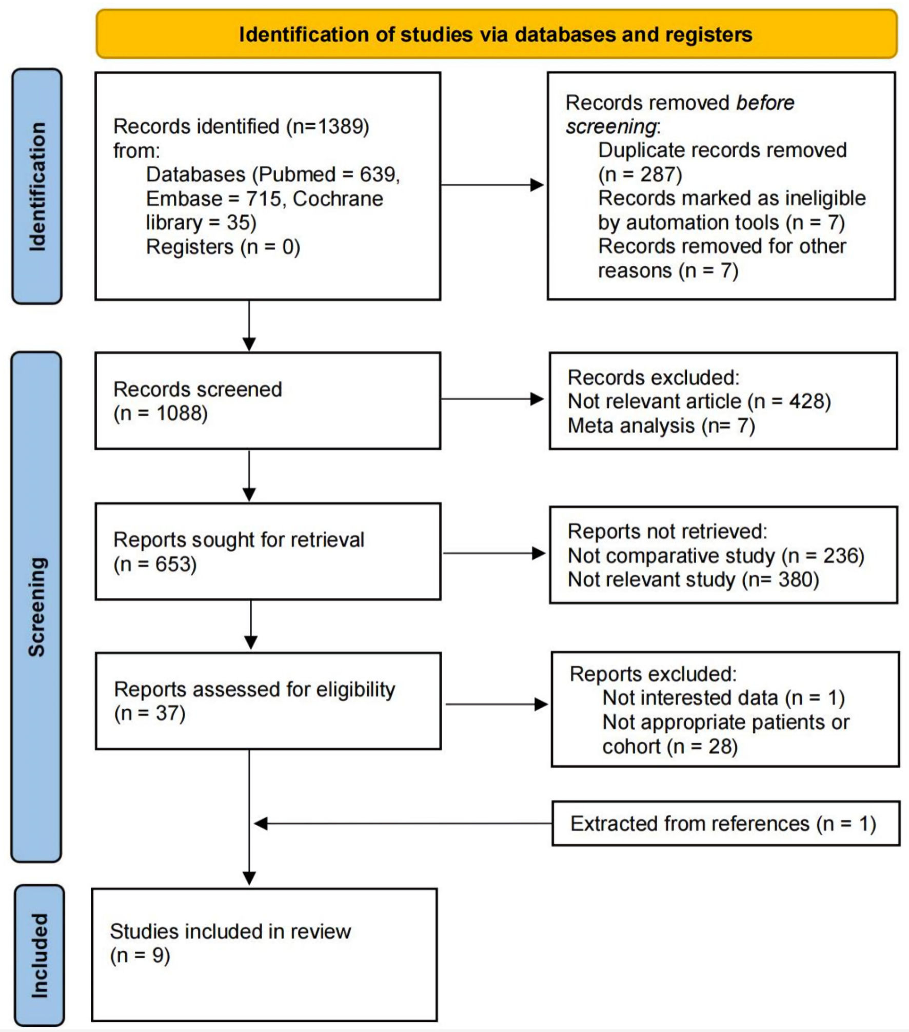 We initially retrieved 1,389 articles from the database. After excluding duplicates and non-English articles, we assessed whether the literature contained the necessary content for our study based on titles and abstracts. If titles and abstracts were not sufficient to determine compliance with our inclusion and exclusion criteria, we read the full text before making a decision. After excluding non-research articles (e.g., reviews, case reports/case series, and conference papers), meta-analyses, irrelevant studies, and non-comparative studies, there were nine articles comprising case-control studies with both LPN and LRN cohorts. Among these, one article did not provide separate data for laparoscopic surgery patients and open surgery patients within the cohorts [8], making it unable to provide the patient cohort data necessary for our study. Therefore, that article was excluded. Subsequently, we screened the references of studies comparing LPN and LRN cohorts and identified an article that met our criteria [9]. In the end, nine studies were included in this meta-analysis (Fig. 1).