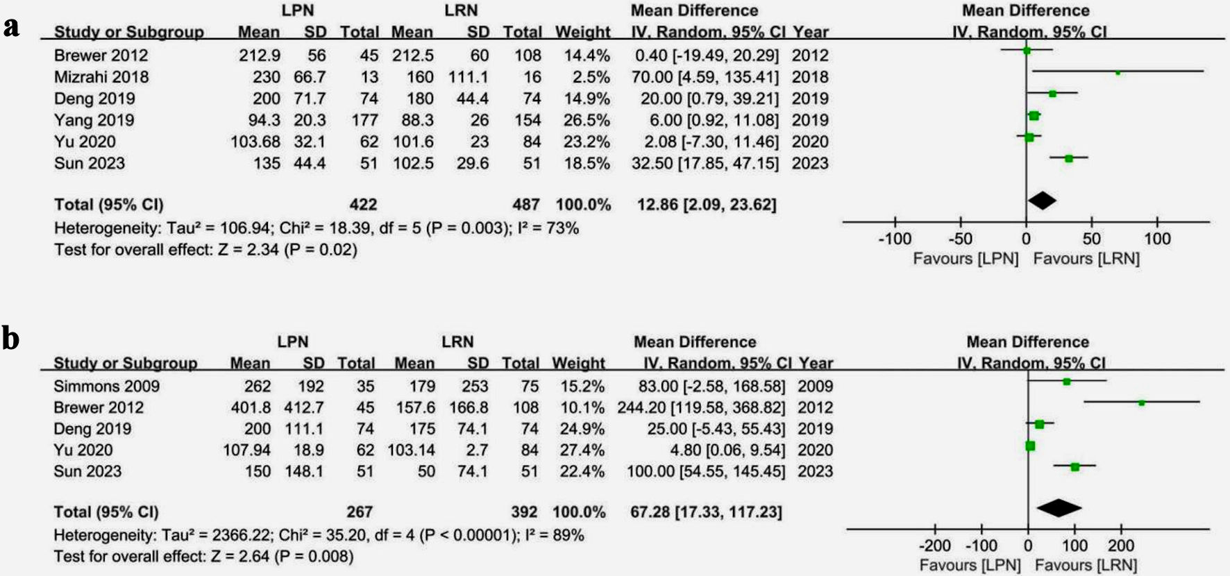 Figure 2 presents a comparative analysis of perioperative outcomes between LPN and LRN groups across multiple studies. In six studies comprising 909 patients (422 LPN, 487 LRN), LPN exhibited longer surgery times by 12.86 min (95% CI (2.09, 23.62), P = 0.02). Furthermore, pooling data from five studies involving 659 patients indicated that LPN was associated with higher blood loss by 67.28 mL (95% CI (17.33, 117.23), P = 0.008) (Fig. 2b). The presence of high heterogeneity (surgery time: Chi2 = 18.39, I2 = 73%, P = 0.003; intraoperative blood loss: Chi2 = 35.20, I2 = 89%, P < 0.00001) underscores diverse study results, necessitating cautious interpretation.