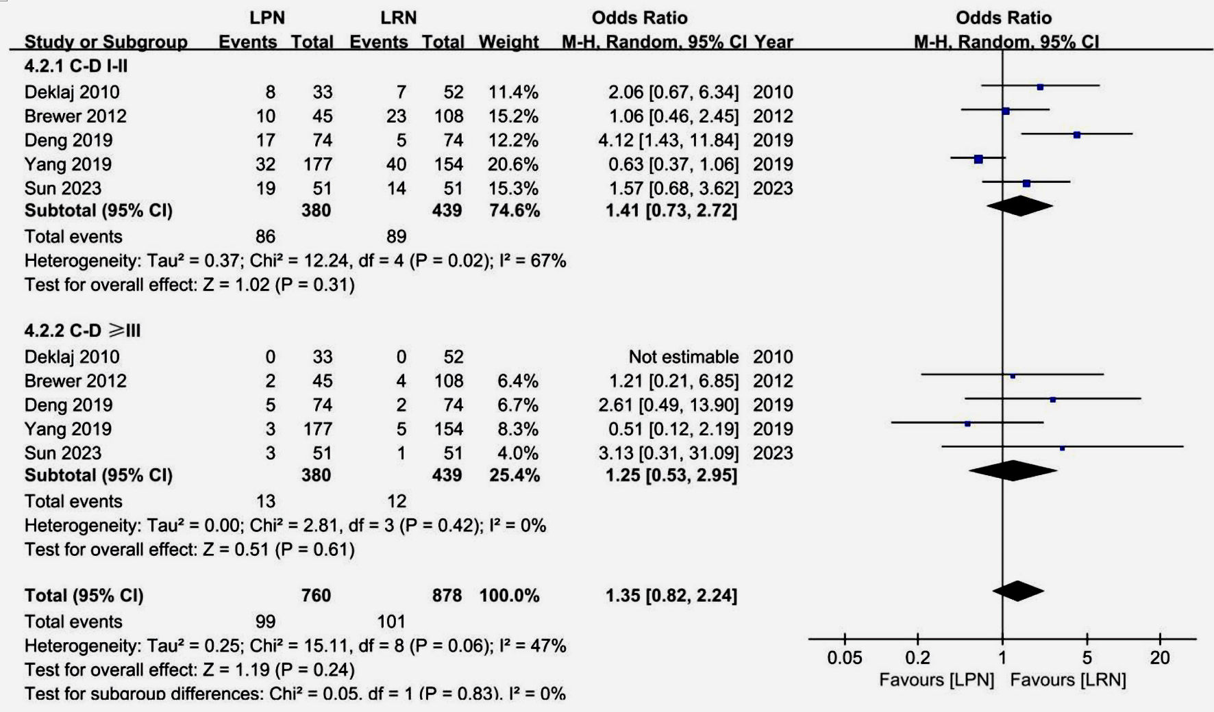 Figure 3 undertakes an examination of perioperative complications within the context of LPN versus LRN groups. Utilizing the Clavien-Dindo system, the analysis reveals no statistically significant differences in complication rates between the two groups, whether classified as grade I - II (OR: 1.41, 95% CI: (0.73, 2.72), P = 0.31) or ≥ grade III (OR: 1.25, 95% CI (0.53, 2.95), P = 0.61). Moreover, the overall incidence of complications demonstrates similarity (OR: 1.35, 95% CI (0.82, 2.24), P = 0.24). While moderate heterogeneity is observed in grade I - II complications (Chi2 = 12.24, I2 = 67%, P = 0.02), it remains minimal or non-significant in other facets of the analysis.