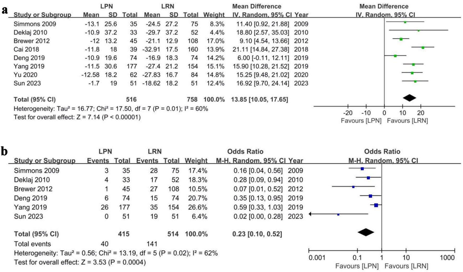 Figure 4 compares the changes in renal function post-surgery between the LPN and LRN groups. Across eight studies involving 1,274 patients, the LPN group exhibited a smaller decline in eGFR (ranging from 1.7 to 13.1 mL/min) compared to the LRN group (ranging from 16.9 to 32.91 mL/min), with a significant difference in decline favoring LPN (WMD 13.85 mL, 95% CI (10.05, 17.65), P < 0.00001) (Fig. 4a). Among 929 patients from six studies, a lower proportion of patients in the LPN group (40 out of 415) developed CKD (GFR < 60 mL/min) postoperatively compared to the LRN group (141 out of 514), indicating a significantly reduced incidence of postoperative CKD in the LPN group (OR: 0.23, 95% CI (0.10, 0.52), P = 0.0004) (Fig. 4b). Moderate heterogeneity was observed among the studies regarding both eGFR decline (Chi2 = 17.50, I2 = 60%, P = 0.01) and CKD incidence increases (Chi2 = 13.19, I2 = 62%, P = 0.02).
