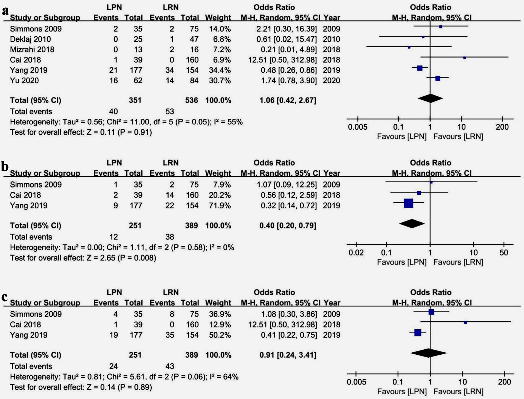 Figure 5 presents the oncological outcomes from the studies. Data from six studies involving 887 patients indicated a slightly higher, albeit statistically insignificant, tumor recurrence rate (including local recurrence and distant metastasis) in the LPN group compared to LRN (OR: 1.06, 95% CI (0.42, 2.67), P = 0.91), with moderate study heterogeneity (Chi2 = 11.00, I2 = 55%, P = 0.05). CSM rates from three studies including 640 patients were significantly lower in LPN than LRN (OR: 0.40, 95% CI (0.20, 0.79), P = 0.008). OM rates did not differ significantly between the groups (OR: 0.91, 95% CI (0.24, 3.41), P = 0.89). Heterogeneity was low for CSM (Chi2 = 1.11, I2 = 0%, P = 0.58) and moderate for OM (Chi2 = 5.61, I2 = 64%, P = 0.06) (Fig. 5).