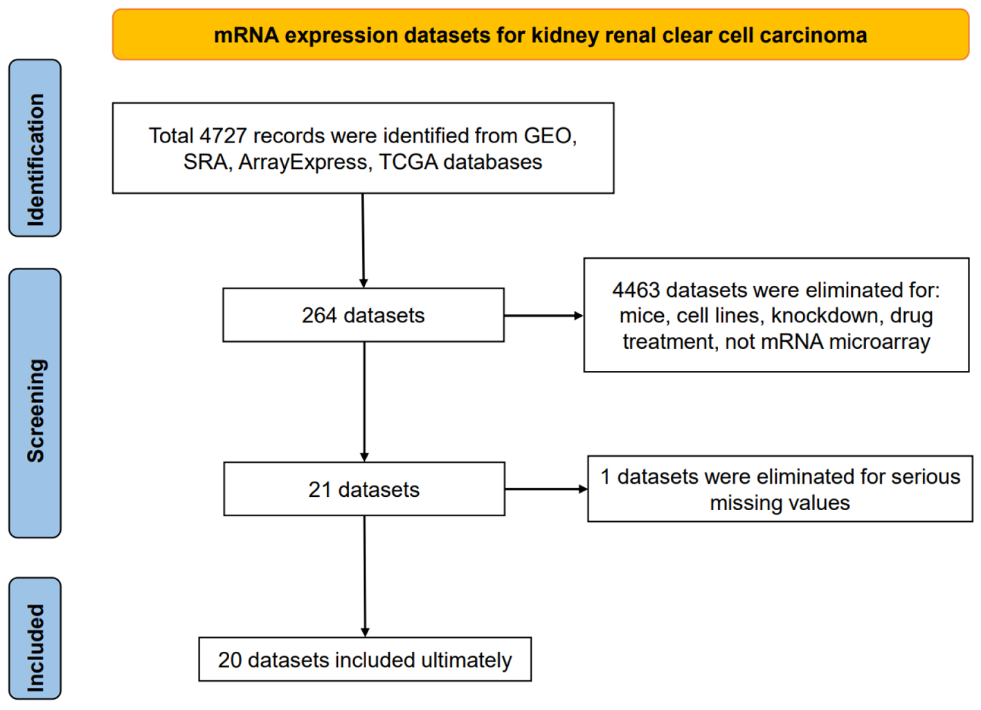 Microarray profiles utilized in this research were sourced from the gene expression omnibus (GEO) [16], ArrayExpress [17], sequence read archive, and the cancer genome atlas (TCGA) databases [18]. RNA-seq datasets for KIRC were retrieved from the GEO database using the search string (“kidney clear cell carcinoma” OR KIRC OR “clear cell renal cell carcinoma” OR ccRCC). The datasets were filtered according to the following criteria: 1) studies involving Homo sapiens; 2) sequencing of coding RNA; 3) datasets including both KIRC tissues (with no fewer than three cases) and non-KIRC tissues (with no fewer than three cases). Datasets were excluded if they met the following conditions: 1) involvement of genetic modification or drug treatment; 2) presence of substantial missing values. Additionally, transcripts per million (TPM) data for KIRC from the TCGA database were obtained using the TCGAbiolinks package (accessed July 12, 2021). Subsequently, all non-standardized datasets were normalized by log2(x + 1). To avoid batch effects, independent datasets from the same platform were combined to generate a unified platform dataset.