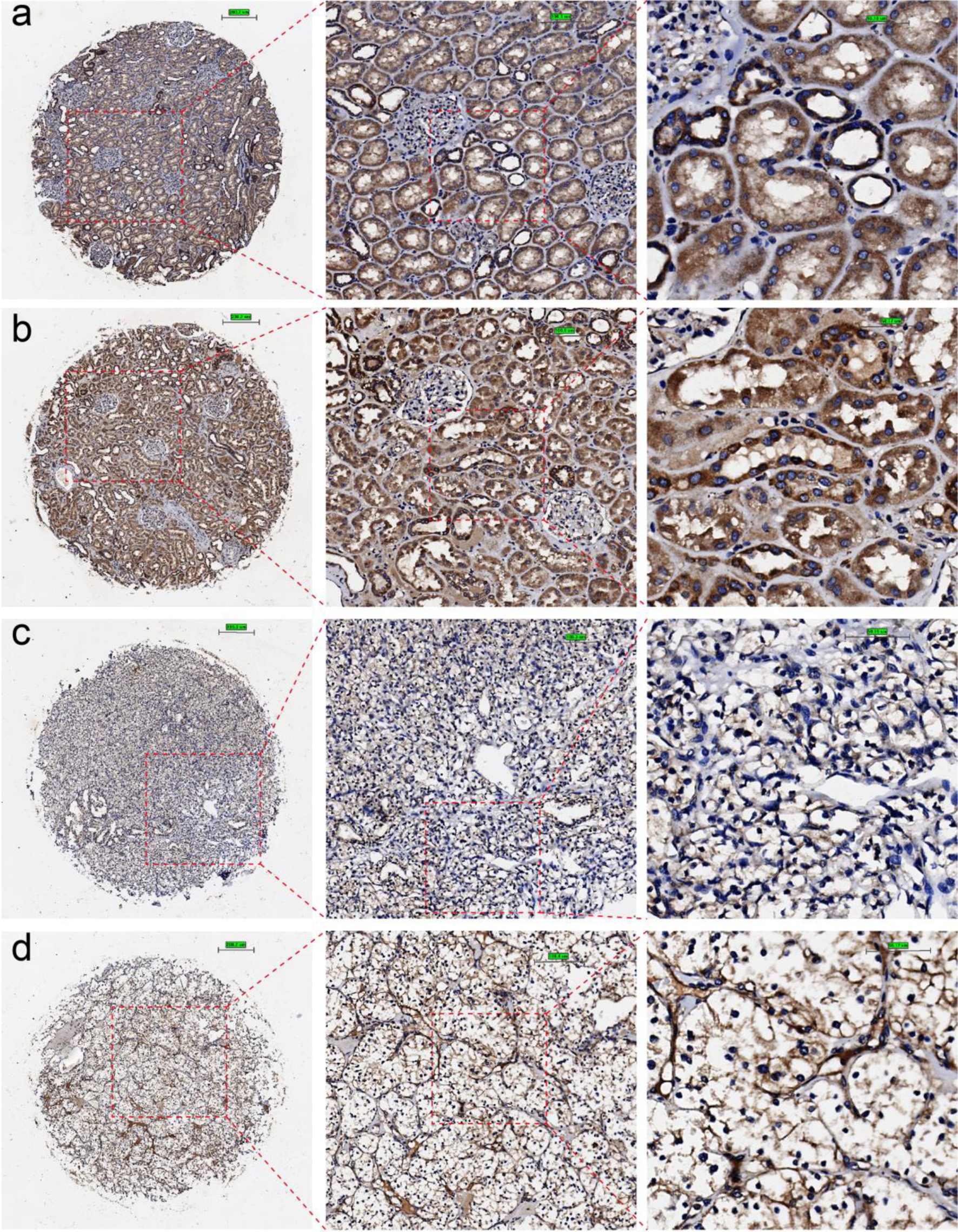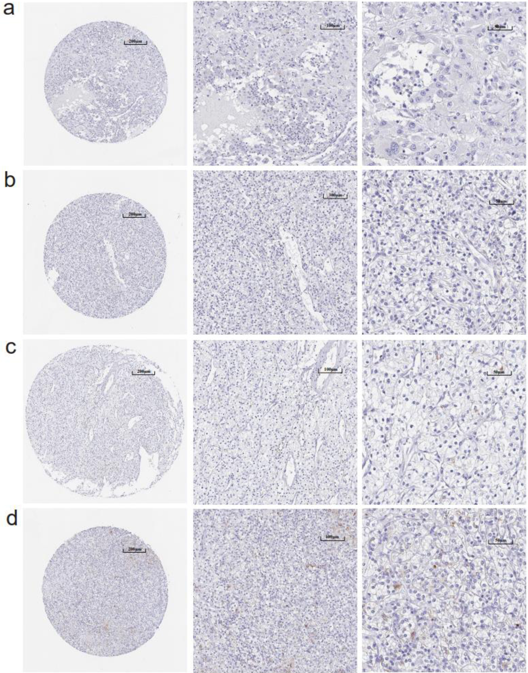![]() Click for large image | Figure 2. Immunohistochemical staining of claudin 8 (CLDN8) protein in non-KIRC and KIRC tissues. (a, b) Non-KIRC tissues. (c, d) KIRC tissues. KIRC: kidney renal clear cell carcinoma. |