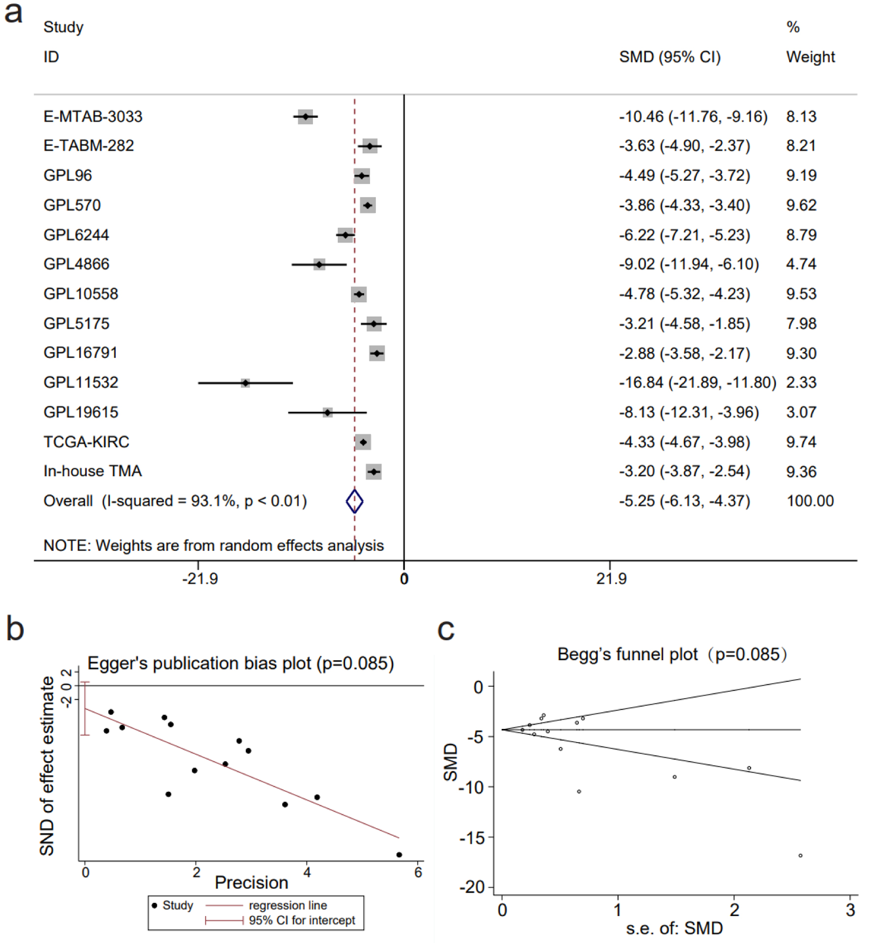 ![]() Click for large image | Figure 4. The decline in claudin 8 (CLDN8) expression in kidney renal clear cell carcinoma. (a) Forest plot depicting significant downregulation of CLDN8 expression in kidney renal clear cell carcinoma tissues. (b) Egger’s plot and (c) Begg’s funnel plot indicate the absence of publication bias (P = 0.09). |