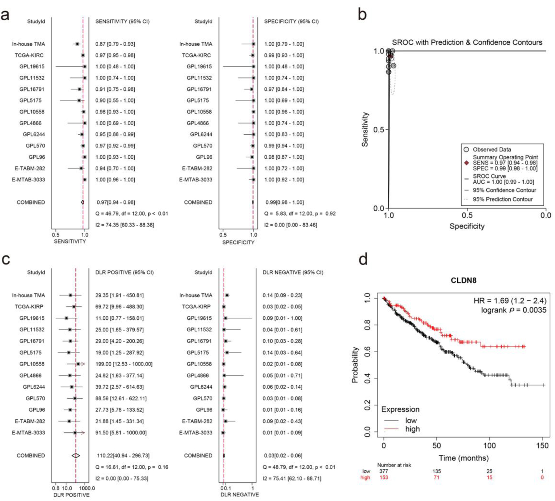 An integrated SMD analysis of mRNA datasets and in-house tissue microarrays revealed significantly lower CLDN8 expression in 1,165 KIRC tissues compared to 468 non-KIRC tissues (SMD = -5.25; 95% confidence interval (CI): -6.13 to -4.37; I2 = 93.1%; P < 0.01) (Fig. 4a). No publication bias was detected (P = 0.09) (Fig. 4b, c). The SROC curve and forest plot confirmed the robust potential of CLDN8 in distinguishing KIRC from non-KIRC tissues (AUC = 1.00, 95% CI: 0.99 - 1.00; sensitivity = 0.97, 95% CI: 0.94 - 0.96; specificity = 0.99, 95% CI: 0.98 - 1.00; positive likelihood ratio = 110.22, 95% CI: 40.94 - 296.73; negative likelihood ratio = 0.03, 95% CI: 0.02 - 0.06) (Fig. 5a-c). Furthermore, survival analysis indicated that lower CLDN8 expression in KIRC was associated with shorter survival time (hazard ratio of CLDN8 downregulation = 1.69, 95% CI: 1.2 - 2.4) (Fig. 5d). Apart from ethnicity, CLDN8 expression showed no significant association with clinicopathological features such as gender, age, tumor grade, and tumor stage (Supplementary Material 5, www.wjon.org).