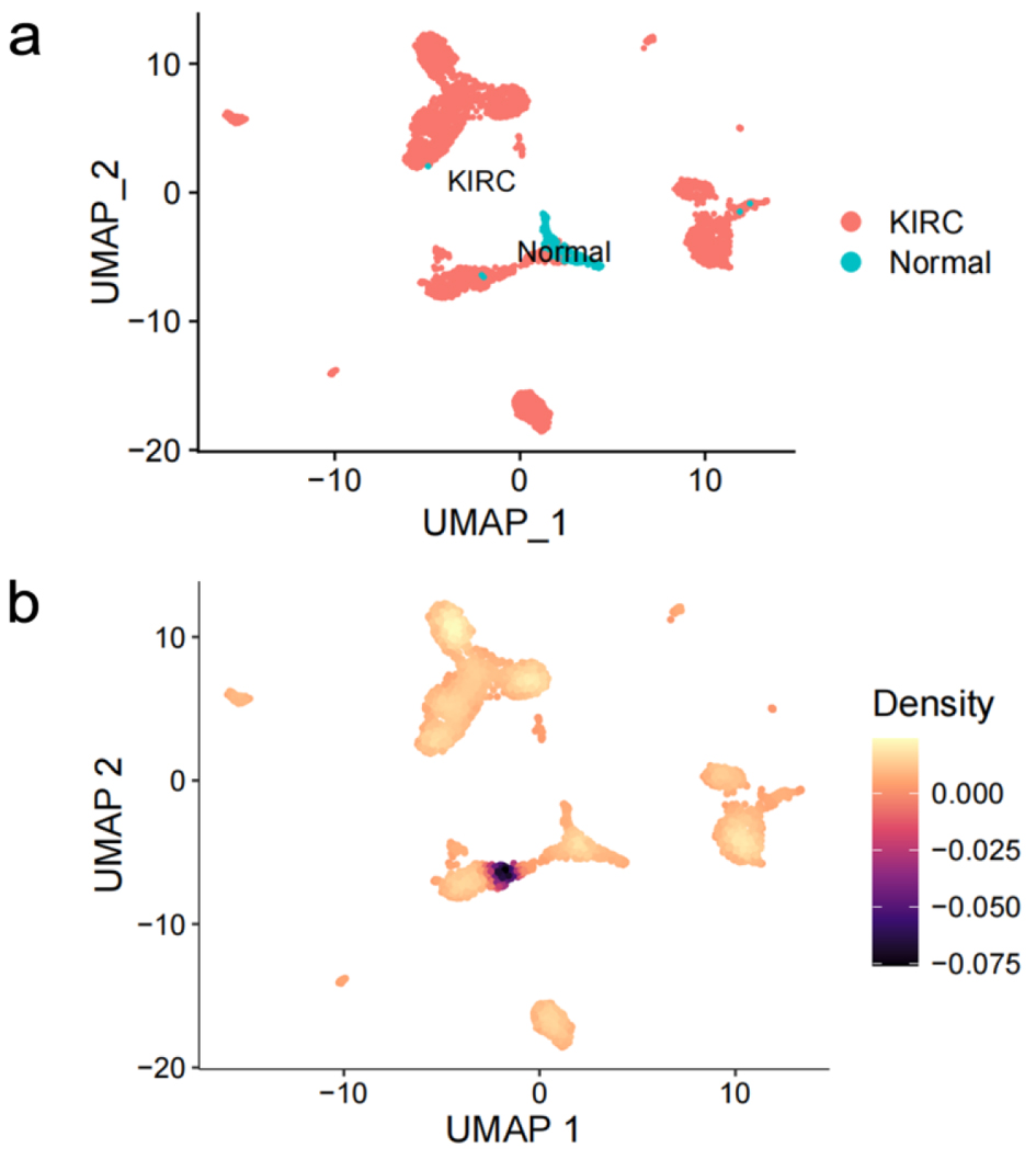 ![]() Click for large image | Figure 6. Expression profiling of claudin 8 (CLDN8) in single cells of kidney renal clear cell carcinoma. (a) Cell distribution in kidney renal clear cell carcinoma (KIRC). (b) Comparative analysis of CLDN8 mRNA expression levels in KIRC cells and normal cells. |