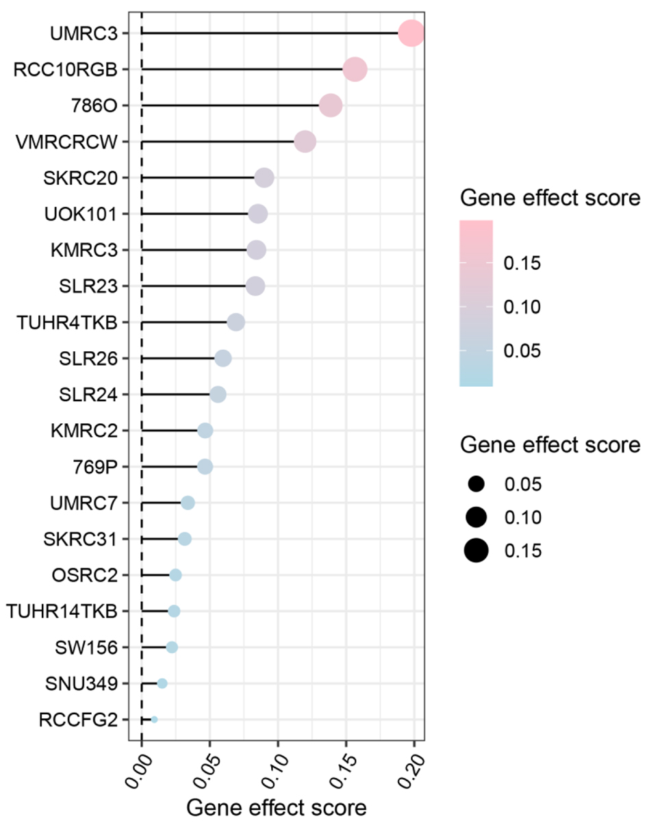![]() Click for large image | Figure 7. Gene effect score analysis of claudin 8 (CLDN8) in 20 kidney renal clear cell carcinoma cell lines. The findings suggest a potential inhibitory role of CLDN8 in the growth of kidney renal clear cell carcinoma cells. |