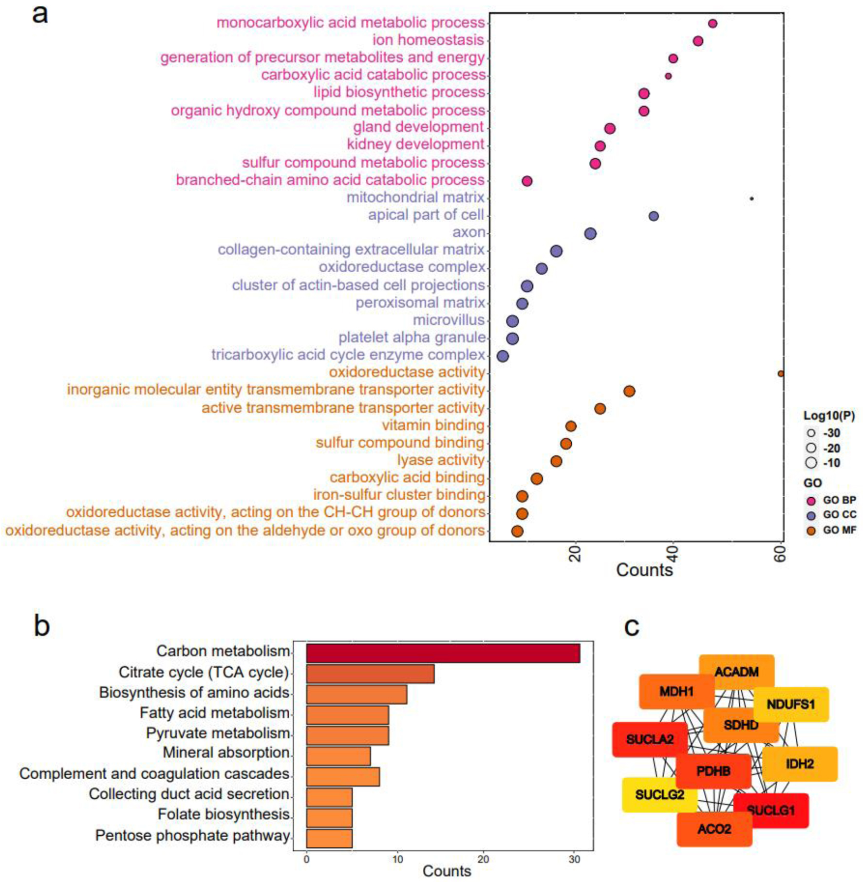 For GO enrichment analysis, the terms “carboxylic acid catabolic process” in biological processes (BP), “mitochondrial matrix” in cellular components (CC), and “oxidoreductase activity” in molecular functions (MF) were identified as highly enriched (Fig. 8a). In KEGG pathways analysis, “carbon metabolism” and “citrate cycle (TCA cycle)” were emphasized (Fig. 8b). Ten hub genes, including ACADM, ACO2, NDUFS1, PDHB, SDHD, SUCLA2, SUCLG1, SUCLG2, MDH1, and IDH2, were identified (Fig. 8c). Notably, eight of these hub genes, namely ACADM, ACO2, NDUFS1, PDHB, SDHD, SUCLA2, SUCLG1, and SUCLG2, exhibited significant correlations with overall survival in KIRC patients (Fig. 9a). A functional interaction network was constructed using these eight hub genes, with FH being identified as prominent (Fig. 9b).