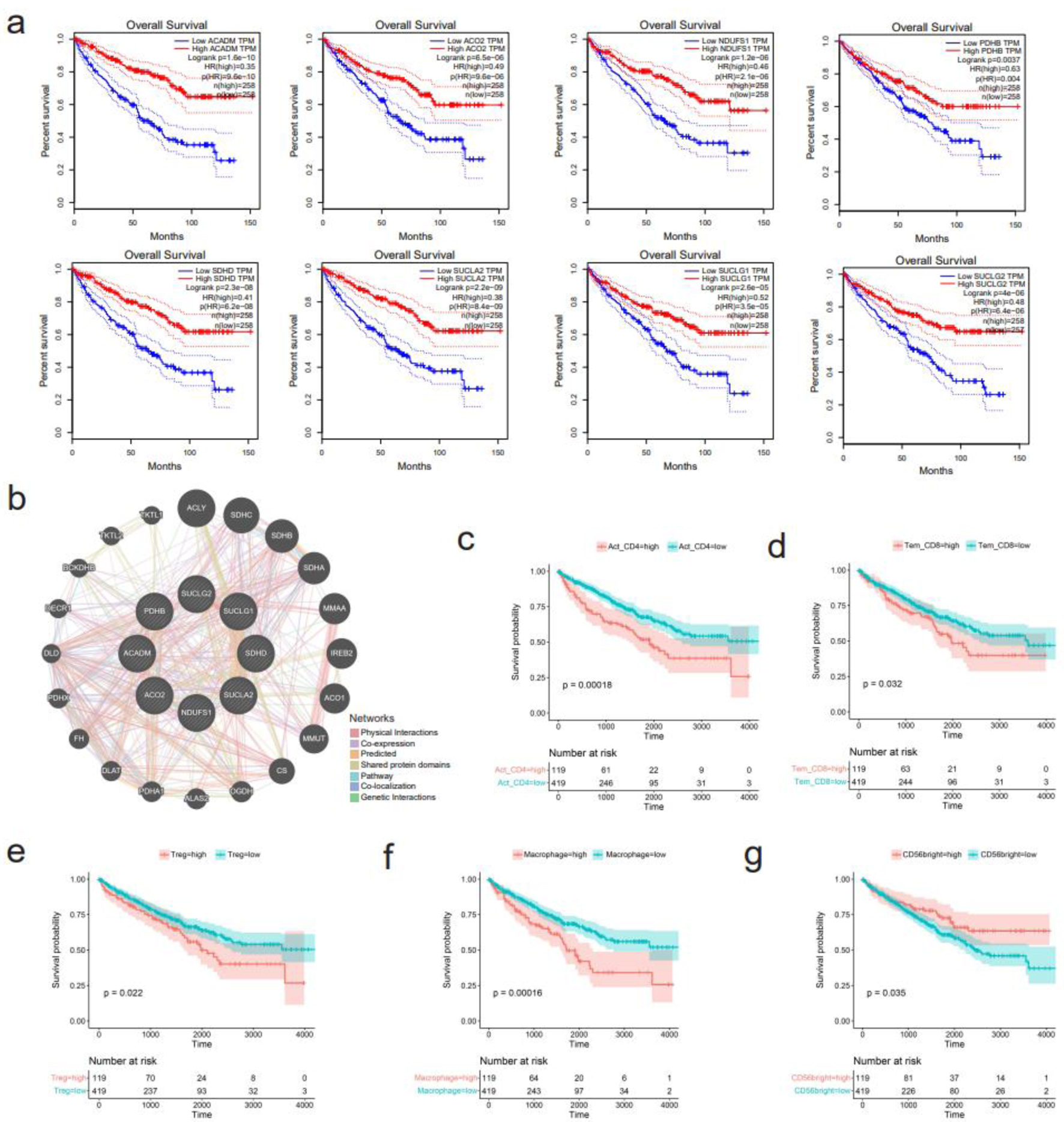 ![]() Click for large image | Figure 9. Survival analysis of hub genes and several immune cells. (a) Downregulation of eight hub genes, including ACADM, ACO2, NDUFS1, PDHB, SDHD, SUCLA2, SUCLG1, and SUCLG2, correlates with shorter overall survival of kidney renal clear cell carcinoma (KIRC) patients. (b) Functional interaction network of the eight hub genes using GeneMANIA algorithm. (c-g) Correlation between infiltration levels of various immune cells and survival of KIRC patients. (c) Activated CD4+ T cells. (d) Effector memory CD8+ T cells. (e) Regulatory T cells. (f) Macrophage. (g) CD56bright natural killer cells. |