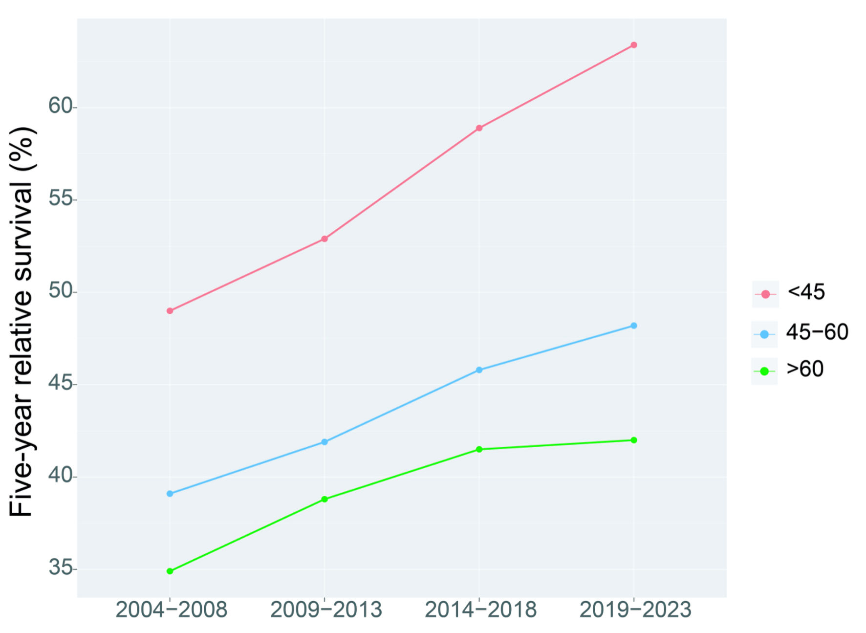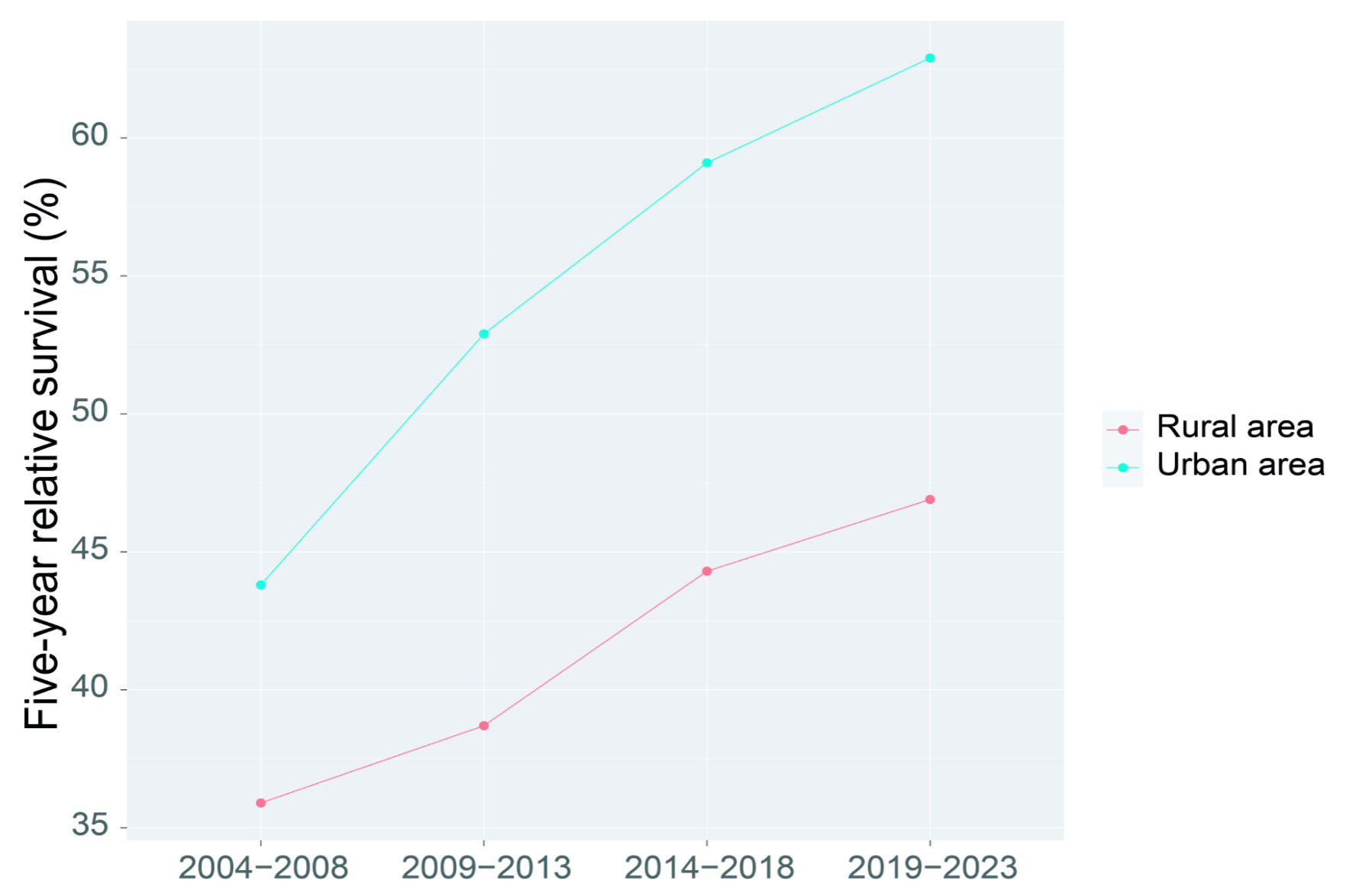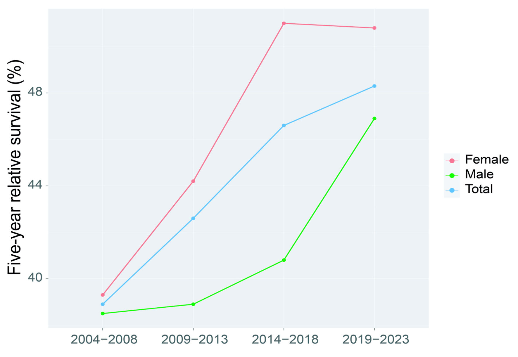 As shown in Table 3, by using survival data and model-based period analysis (using a GLM) for three consecutive 5 years (2004 - 2008, 2009 - 2013, and 2014 - 2018), it is predicted that the overall 5-year RS for the next 5 years (2019 - 2023) may reach 48.3% (46.9% for males, 50.8% for females). We also found a clear age gradient for 5-year RS, falling from 63.4% at diagnosis < 45 years to 42.0% at > 60 years. The 5-year RS was higher in urban areas compared to rural areas (62.9% vs. 46.9%). We found a clear upward trend in 5-year RS overall and stratified by sex, age at diagnosis, and region over the period 2004 - 2023 (Figs. 1-3).