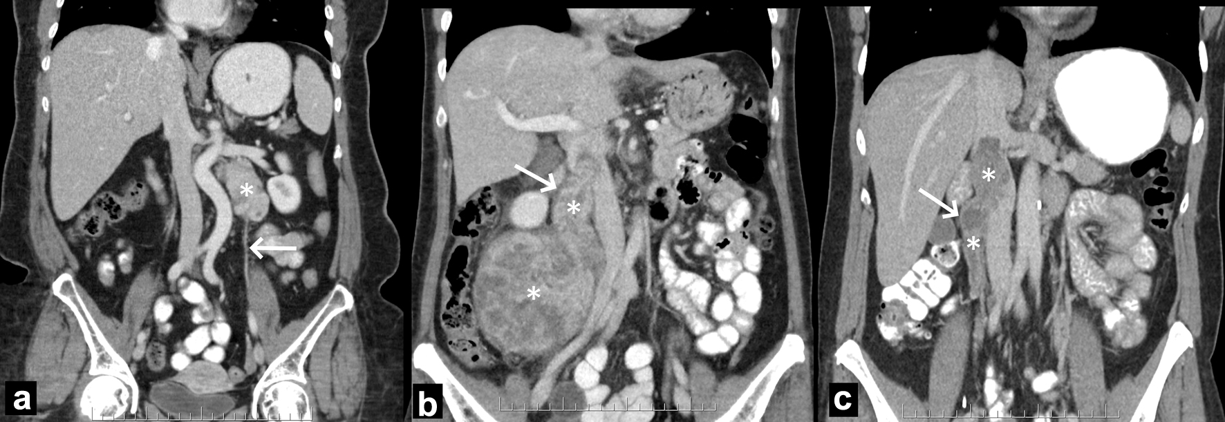 ![]() Click for large image | Figure 1. Illustration of designation of tumor origin in three different patients. (a) Left ovarian vein LMS. The left retroperitoneal tumor (asterisk) is located caudally to the left renal vein and laterally to the aorta. The left ovarian vein (arrow) extends into and from the tumor (not shown). (b) Right ovarian vein LMS. The right retroperitoneal tumor (asterisks) extends up the right ovarian vein (arrow) and into the IVC. (c) IVC IIA. The purely intravascular tumor (asterisks) lies within the right ovarian vein (arrow) and IVC, at and below the left renal vein. Because the tumor had a wider diameter in the IVC than in the ovarian vein, the former was designated as site of origin. IVC: inferior vena cava; LMS: leiomyosarcoma. |