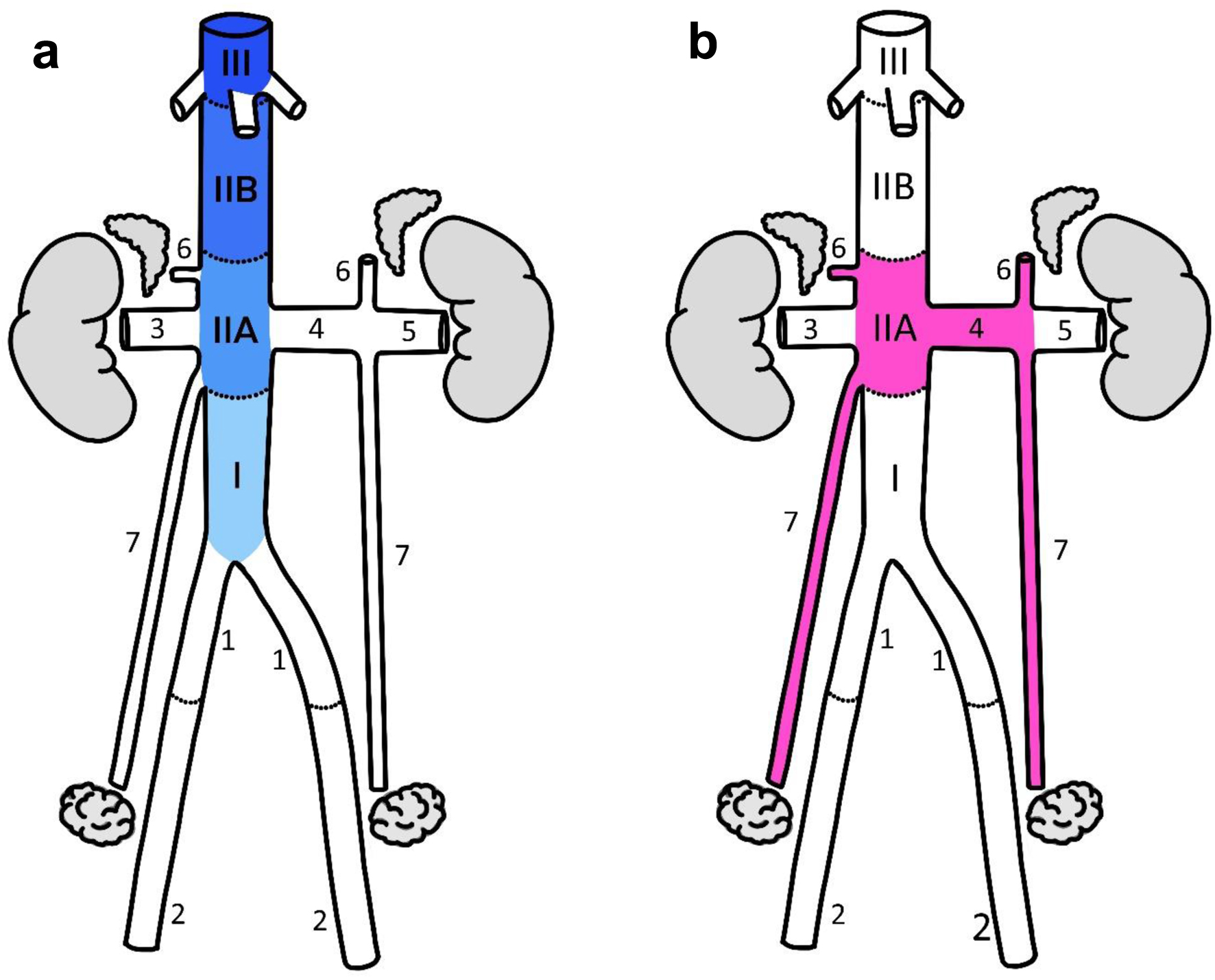The rationale for this grouping was based on studies of showing highest hormone concentration in the primary draining vein, or at the junction of the primary and secondary draining veins [10, 13, 14]. Therefore, the first and immediate second veins draining the hormone-producing organs were included as part of the DPs. The ovarian DP was defined as the right ovarian vein and IVC IIA (for the right side), and the left ovarian vein and medial segment of the left renal vein (for the left side). The SHDP was defined as the combination of the ovarian DP as well as testicular DP (same veins/segments as ovarian DP) and adrenal DP (adrenal veins, IVC IIA and medial segment of left renal vein). Analyses were performed with and without the inclusion of paratesticular tumors as it was unclear if these truly arose in the veins.