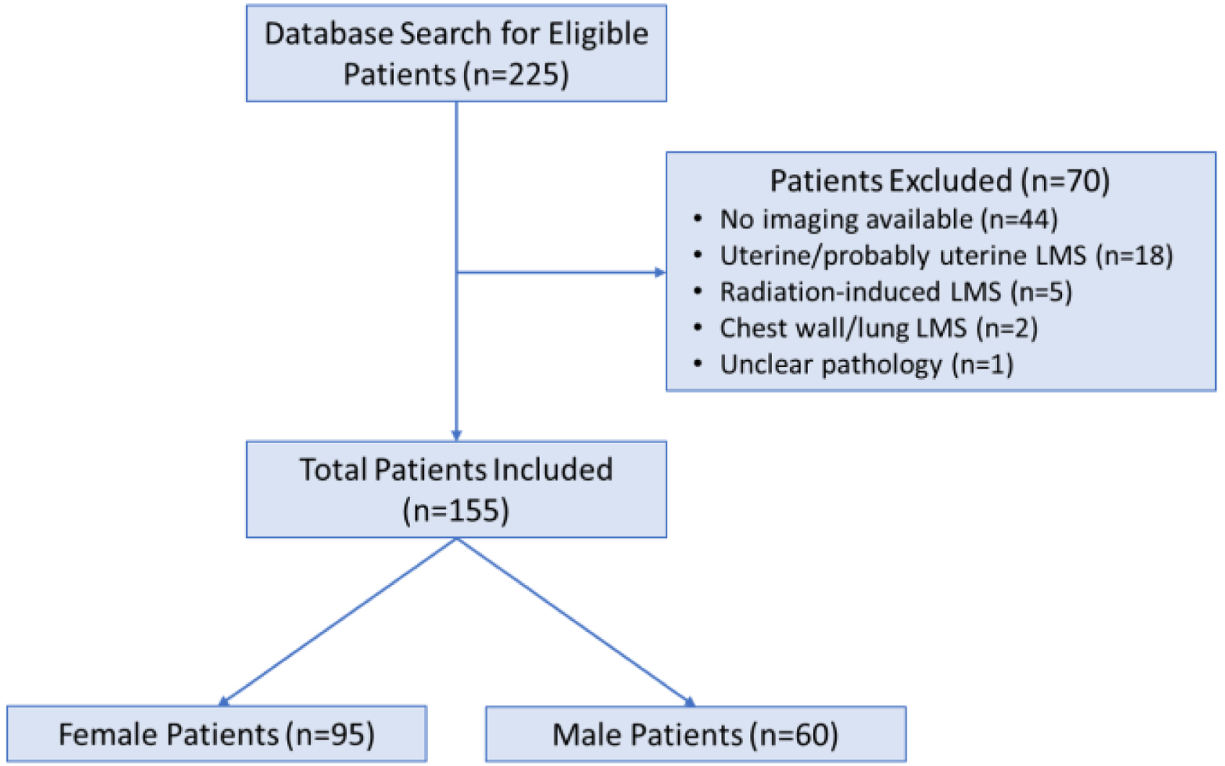 A search of sarcoma, urology, and hepatobiliary databases as well as imaging reports yielded 225 patients with non-uterine LMS. The following inclusion criteria were applied: 1) tumor of non-uterine abdominal/pelvic origin; 2) pretreatment contrast enhanced cross-sectional (computed tomography (CT)/magnetic resonance imaging (MRI)) imaging available for review; 3) definitive diagnosis of LMS by biopsy or surgical pathology as reviewed by the study institution’s pathologists with sarcoma expertise. Because paratesticular tumors were likely to be imaged prior to resection by ultrasound only, an exception was made for this location to allow ultrasound as pretreatment imaging for inclusion in the study. The following exclusion criteria were applied: 1) history of primary uterine LMS; 2) prior radiation to the site of LMS (i.e., exclusion of radiation-induced LMS).