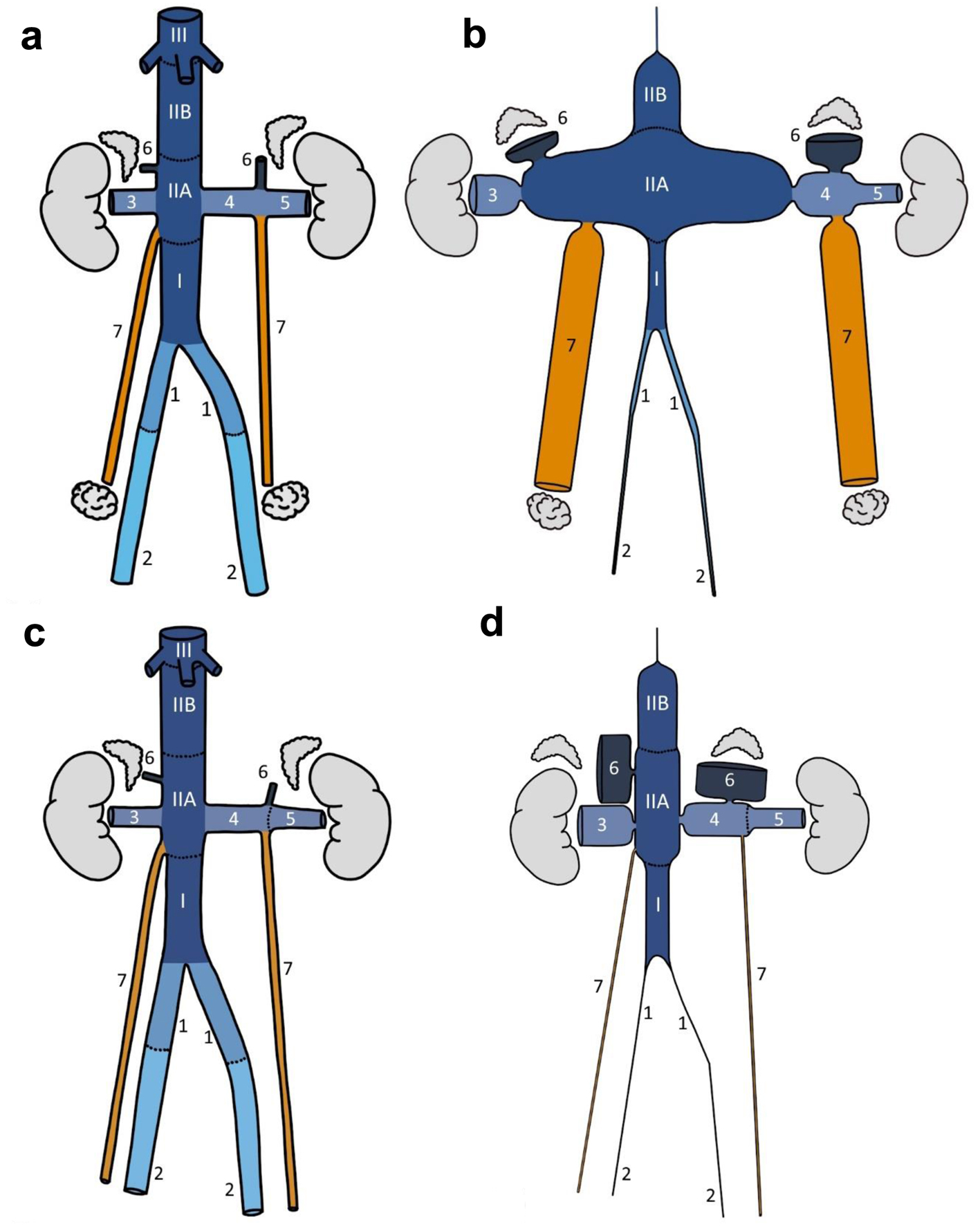 ![]() Click for large image | Figure 4. Normal anatomy (a: female; c: male) and proportional topographical (b: female; d: male) diagrams of selected retroperitoneal veins. The normal vessel lengths and diameter were drawn based on averages from 10 female/male patients in the study cohort. Proportional topographical diagrams are distortions of the anatomy normalized to one variable. For example, the cortical sensory homunculus is a proportional topographical diagram of the body distorted based on the size of the brain cortex supplying the various anatomical regions. These venous proportional topographical diagrams were obtained by altering the vessel diameter based on incidence per mm2 and then normalized to IVC IIB segment. All altered vessels are therefore proportional to IVC IIB segment. Anatomical annotations: I, IIA, IIB, III, IVC segments; 1 - common iliac vein, 2 - external iliac vein, 3 - right renal vein, 4 - medial left renal vein, 5 - lateral left renal vein, 6 - adrenal vein, 7 - ovarian/testicular vein. |