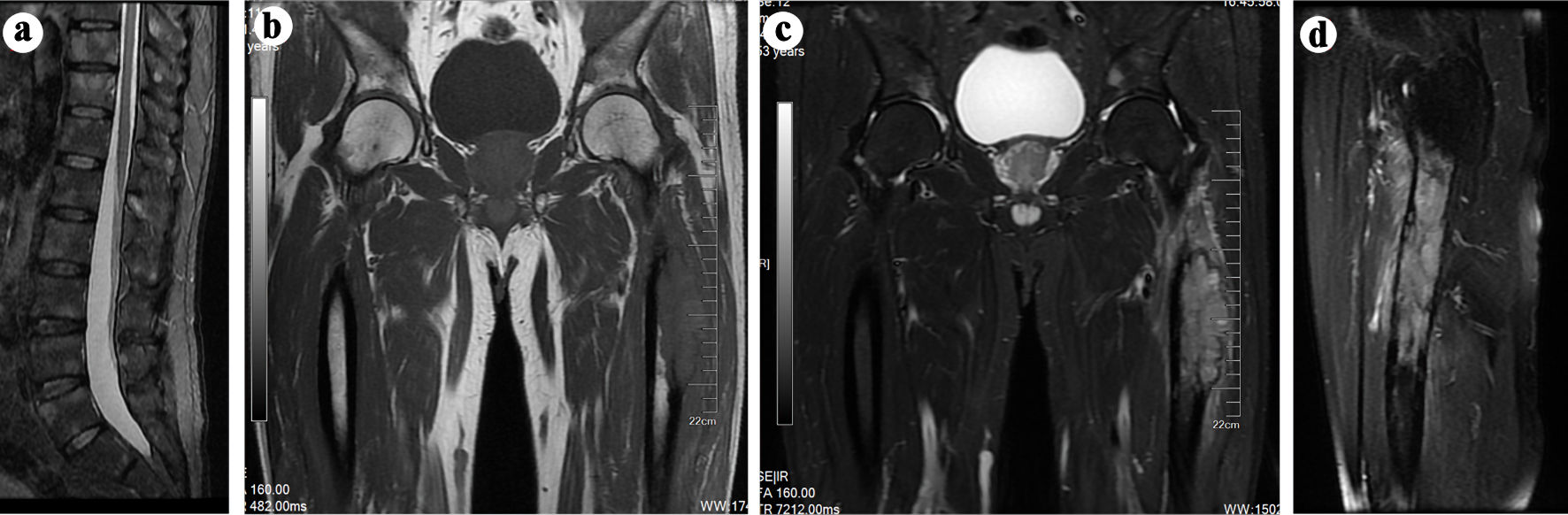 ![]() Click for large image | Figure 1. (a-c) MRI scans indicating potential multiple metastatic lesions in bilateral proximal femur, ilium, ischium, pubis, and spine. (b) T1-weighted sagittal spin-echo sequence of the thigh and hip joint displaying a hypointense lesion in the left proximal femur. (c, d) T2-weighted sagittal spin-echo sequence with fat-suppression demonstrating a hyperintense lesion involving intraosseous and extraosseous soft tissue in the left proximal femur. MRI: magnetic resonance imaging. |
