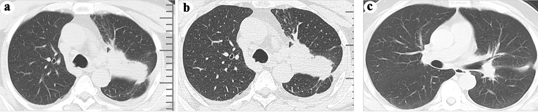 ![]() Click for large image | Figure 2. (a) A neoplasm in the left upper lobe was observed on a computed tomography (CT) scan. (b) The presence of a neoplasm in the left lung was confirmed through an enhanced CT scan. (c) A follow-up CT scan at 3 months after osimertinib administration revealed shrinkage of the neoplasm in the left upper lobe. |