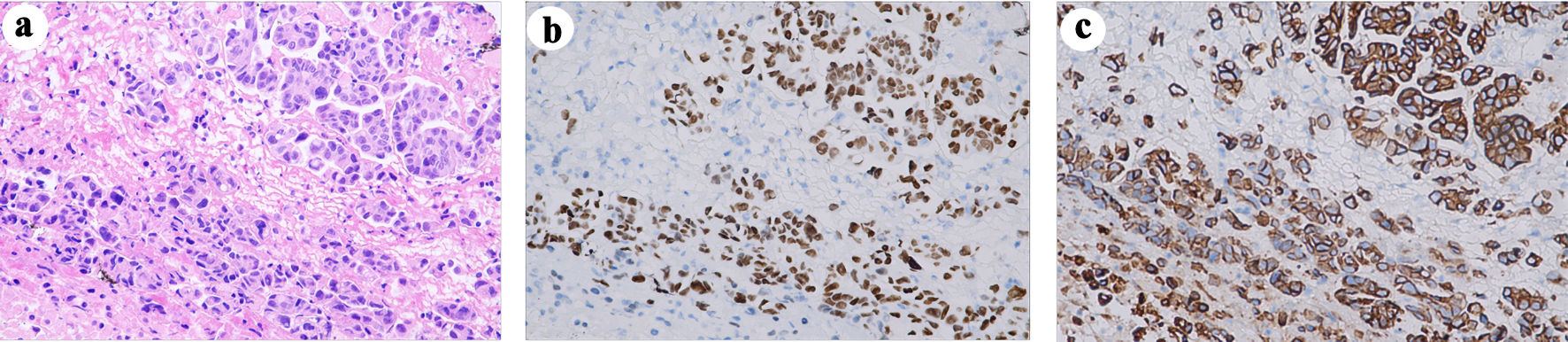 ![]() Click for large image | Figure 3. (a) H&E staining (original magnification, × 400) depicting tumor cell morphology. Immunohistochemical analysis revealed expressions of CK7 ((b) original magnification, × 400) and TTF1 ((c) original magnification, × 400), confirming the diagnosis of lung adenocarcinoma. H&E: hematoxylin and eosin; CK7: cytokeratin 7; TTF1: thyroid transcription factor 1. |