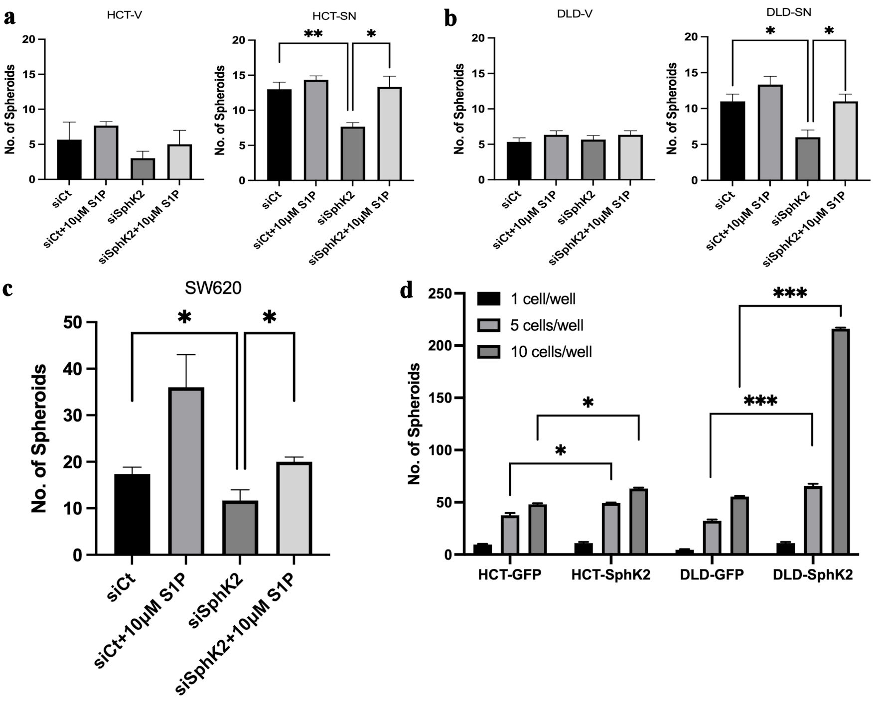 To confirm the role of SPHK2 in CRC stemness, we ectopically expressed SPHK2 in both HCT116 and DLD-1 cells (HCT-SPHK2 and DLD-SPHK2) (Supplementary Material 3, www.wjon.org). Similar to ectopic SNAI1 expression, ectopic SPHK2 colon cancer cell lines (HCT-SPHK2 and DLD-SPHK2) demonstrated increased spheroid formation compared with control cell lines (HCT-GFP and DLD-GFP) (Fig. 2d, and Supplementary Material 3, www.wjon.org). For instance, DLD-SPHK2 cells demonstrated a four-fold increase (P < 0.001) in spheroid formation compared with control DLD-GFP cells.