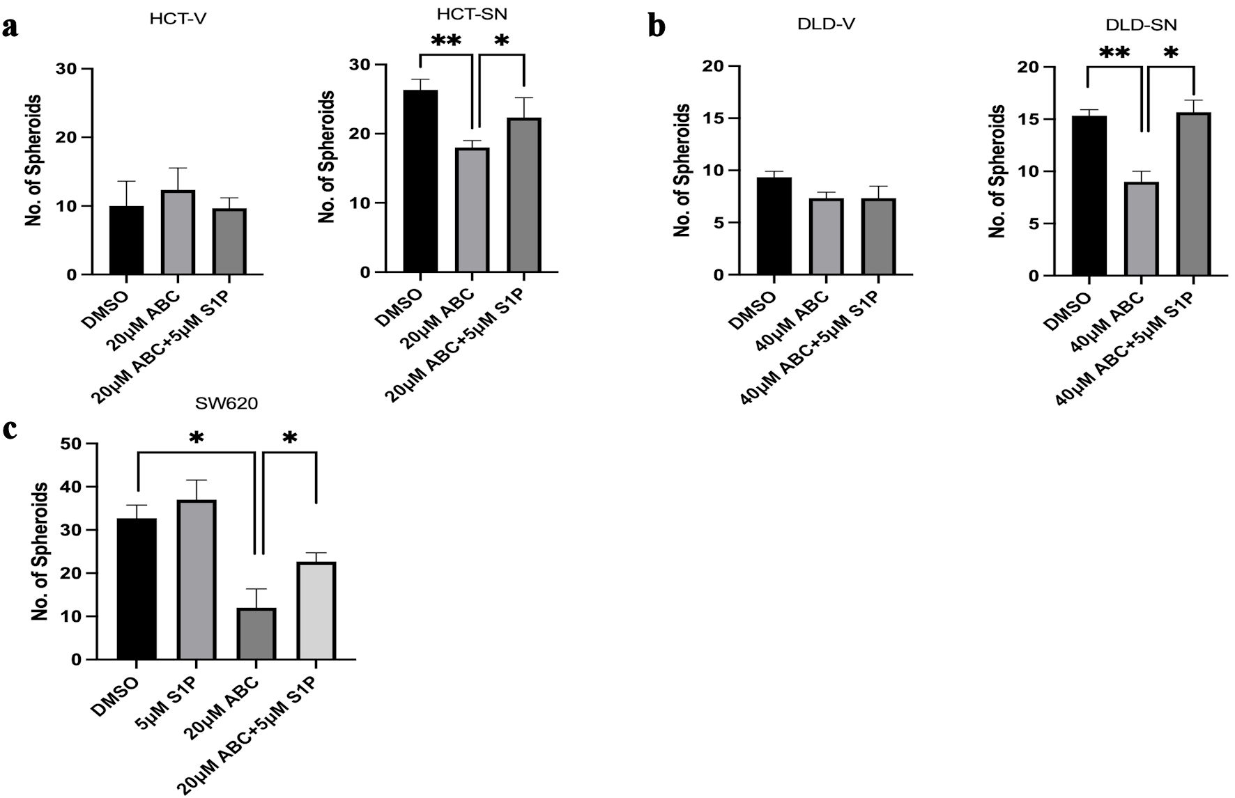 We next evaluated whether ABC294640, the small molecular inhibitor of SPHK2, can reduce SNAI-mediated self-renewal based on in vitro spheroid formation. In both SNAI1 overexpressing cell lines, ABC294640 was able to reduce in vitro spheroid formation compared with vehicle control (Fig. 3a, b). For example, HCT-SN and DLD-SN cells demonstrated a 31% and 40% decrease (P < 0.01) in spheroid formation, respectively, compared with HCT-V and DLD-V cells (Fig. 3a, b). The addition of exogenous S1P rescued SNAI1-mediated spheroid formation in the presence of ABC294640 (Fig. 3a, b). In the SW620 cells, only partial rescue was achieved with S1P, suggesting other non-S1P dependent mechanisms downstream of SPHK2 may be involved (Fig. 3c). These data indicated that SNAI1-mediated self-renewal can be reduced by ABC294640 which was, at least in part, mediated by S1P inhibition.