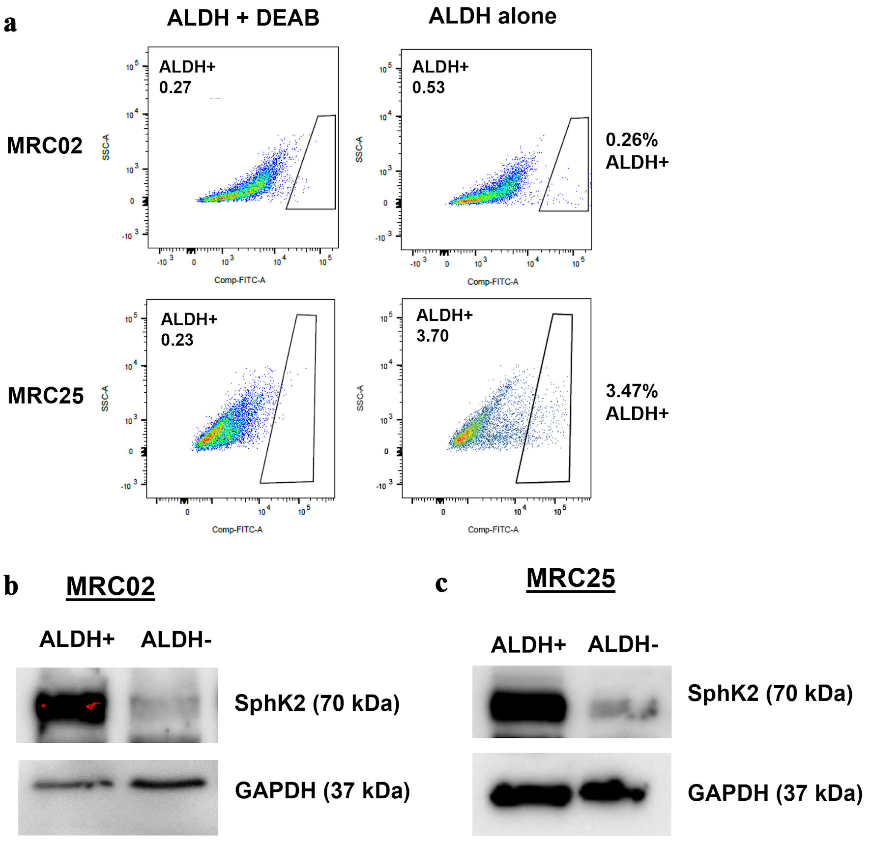 ALDH activity can identify CSCs in fresh human CRC samples [47]. Our previous investigation demonstrated that EpCAM+/ALDH+ cells isolated from CRC PDXs possess in vitro and in vivo stem cell properties and high SNAI1 expression [13]. To investigate the role of SPHK2 in human CRC CSCs, we compared the expression of SPHK2 in EpCAM+/ALDH+ and EpCAM+/ALDH- cells by western blot analysis of CRC PDXs (MRC02 and MRC25), as we have previously reported [13]. EpCAM+/ALDH+ cells from both MRC02 and MRC25 PDX models expressed significantly higher SPHK2 protein compared with EpCAM+/ALDH- cancer cells. For example, MRC02 and MRC25 EpCAM+/ALDH+ cells demonstrated a nine-fold and three-fold increase in SPHK2 protein expression, respectively, compared with EpCAM+/ALDH- cancer cells (Fig. 4a-c, Supplementary Material 4, www.wjon.org). Thus, human CRC CSCs isolated by ALDH activity from PDXs demonstrate elevated expression of SPHK2 compared with expression in CRC non-CSC cells.