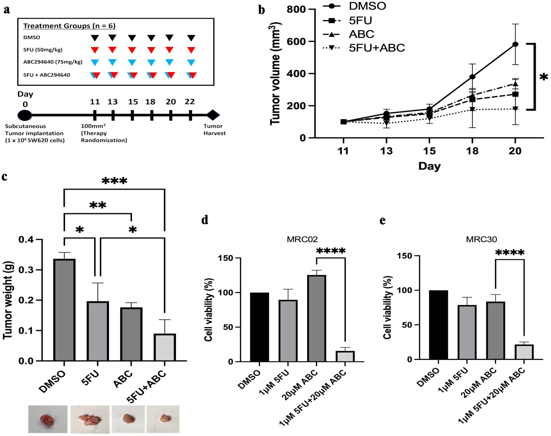 ![]() Click for large image | Figure 6. ABC294640 increases 5FU sensitivity in SW620 in vivo xenografts and CRC PDTOs. Following treatment for 11 days, subcutaneous tumors were harvested and analyzed. (a) In vivo experimental schema. After subcutaneous injection of SW620 cells, mice were randomized to four treatment groups of six mice each, starting 11 days postoperatively. 5FU (50 mg/kg) (red arrows) and 75 mg/kg of ABC294640 (blue arrows) were intraperitoneally injected three times per week. Tumors were harvested 20 - 22 days after tumor implantation. (b) Average measured tumor volume of subcutaneous SW620 xenografts throughout treatment. (c) Average tumor weight of harvested SW620 xenografts. The error bars represent mean ± SD; n = 3 (*P < 0.05, **P < 0.01, ***P < 0.005). (d, e) Cell viability was assessed 96 h after 5FU or ABC294640 treatment compared with vehicle control (DMSO) in two PDTO models: MRC02 (c), and MRC30 (d). Data are shown as mean ± SD; n = 5 (****P < 0.001). CRC: colorectal cancer; 5FU: 5-fluorouracil; SD: standard deviation; PDTOs: patient-derived tumor organoids. |