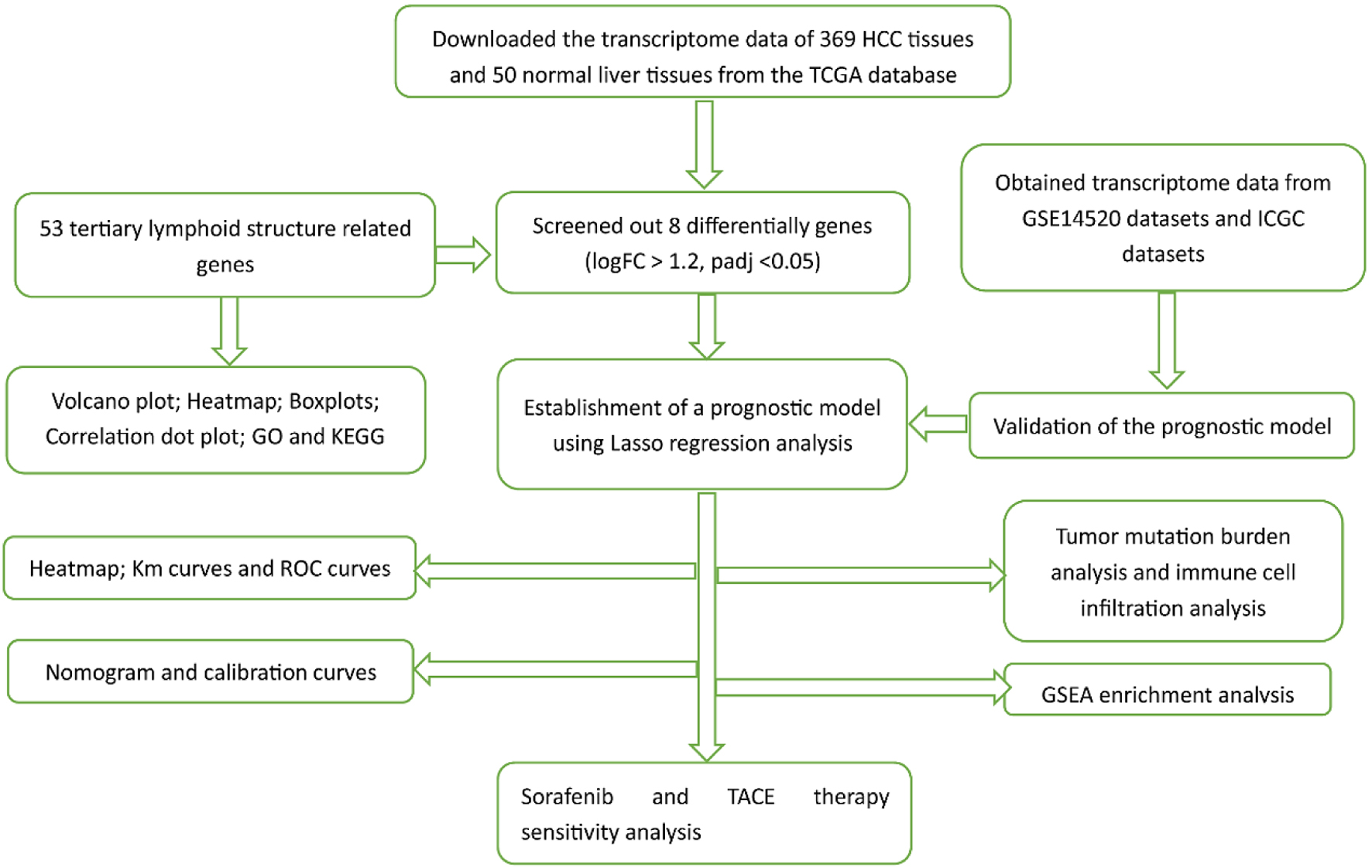 The differentially expressed TLS-related genes in 369 HCC cases and 50 normal samples were found using the “DESeq2” package. As cut-off values, P < 0.05 and |log2 fold change (FC)| > 1.2 were used [15].