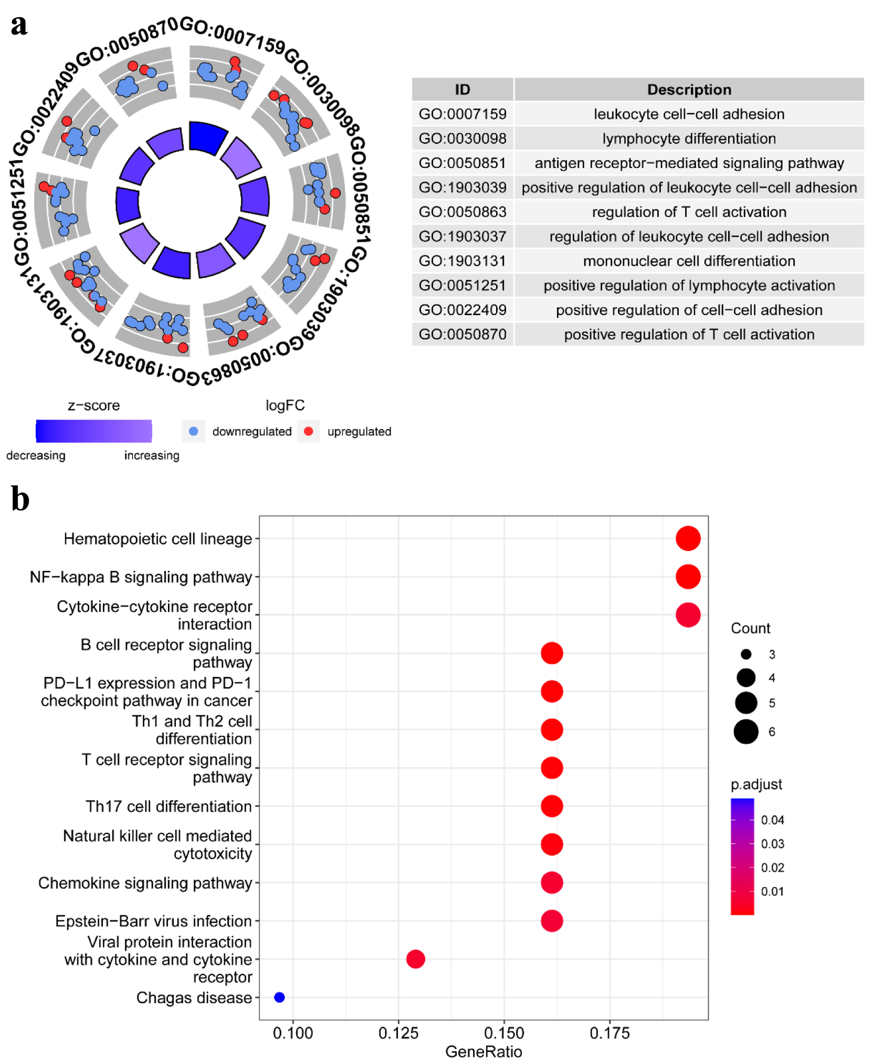 The elaborate procedure of our research is presented in Figure 1. To more clearly illustrate the biological roles of genes connected to TLS, GO and KEGG pathway enrichment analyses were performed. In particular, leukocyte cell-cell adhesion, lymphocyte differentiation, the antigen receptor-mediated signaling pathway, regulation of T-cell activation, mononuclear cell differentiation, and positive regulation of lymphocyte activation were associated with the biological processes of these 53 TLS-related genes (Fig. 2a). Additionally, the analysis of KEGG revealed that the 53 TLS-related genes were involved in hematopoietic cell lineage, NF-kappa B signaling pathway, cytokine-cytokine receptor interaction, B-cell receptor signaling pathway, programmed death-ligand 1 (PD-L1) expression and programmed death-1 (PD-1) checkpoint pathway in cancer, Th1 and Th2 cell differentiation, T-cell receptor signaling pathway, Th17 cell differentiation, natural killer (NK) cell-mediated cytotoxicity, and chemokine signaling pathway (Fig. 2b). These results suggested that these TLS-related genes are involved in immunomodulatory mechanisms.