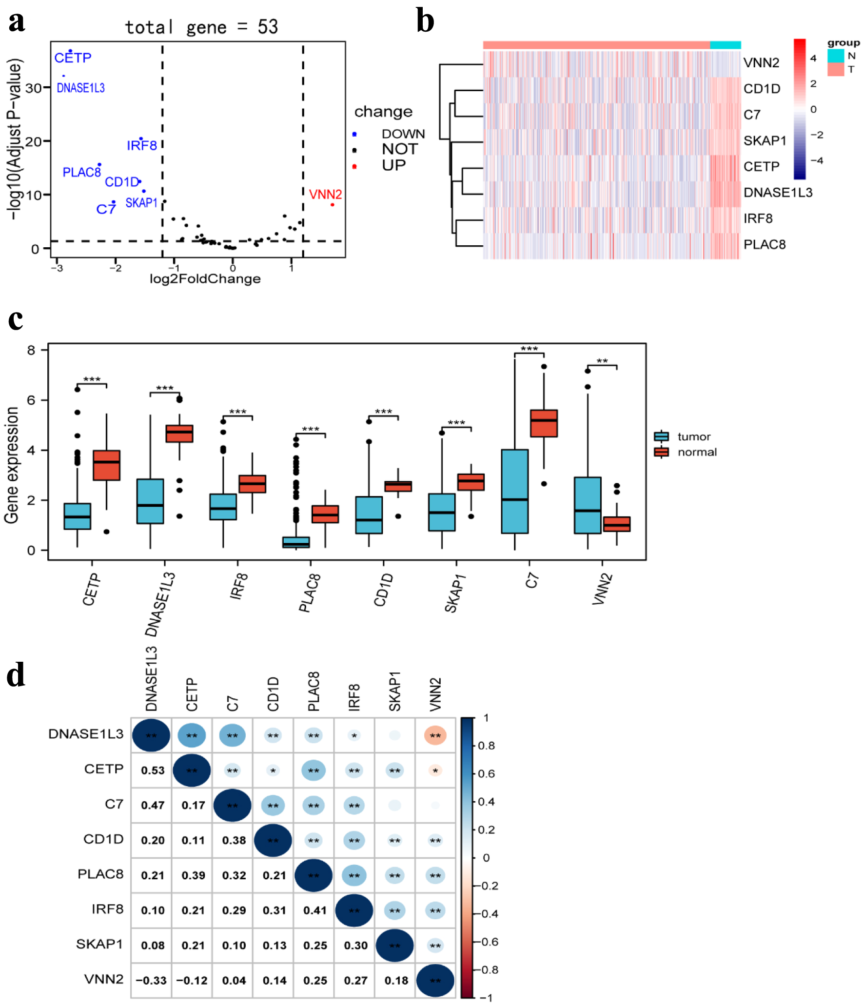 ![]() Click for large image | Figure 3. Differentially expressed TLS-related genes between HCC tissues and normal tissues. (a) Volcano plot indicates TLS-related genes, with red dots indicating high expression and blue dots indicating low expression. (b) Heatmap of differentially expressed TLS-related genes, with red indicating high expression, blue indicating low expression, n representing normal tissues, and t representing tumor tissues. (c) Boxplots of differentially expressed TLS-related genes, with blue boxes representing tumor groups and red boxes representing normal groups. (d) The correlation of TLS-related genes with each other. TLS: tertiary lymphoid structures. |