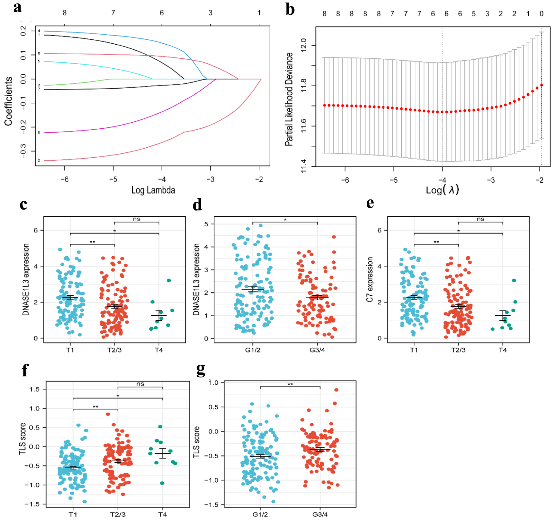 ![]() Click for large image | Figure 4. Construction of a risk prognostic model based on TLS-related genes in the TCGA cohort. (a) Cross-validation for tuning the parameter selection in the LASSO regression. (b) LASSO regression of the 6 OS-related genes. (c, d) The dot plots of T stage (c) and tumor grade (d) with DNASE1L3 expression. (e) The dot plots of T stage with C7 expression. (f, g) The dot plots of T stage (f) and grade (g) with risk score. TLS: tertiary lymphoid structures; LASSO: least absolute shrinkage and selection operator. |