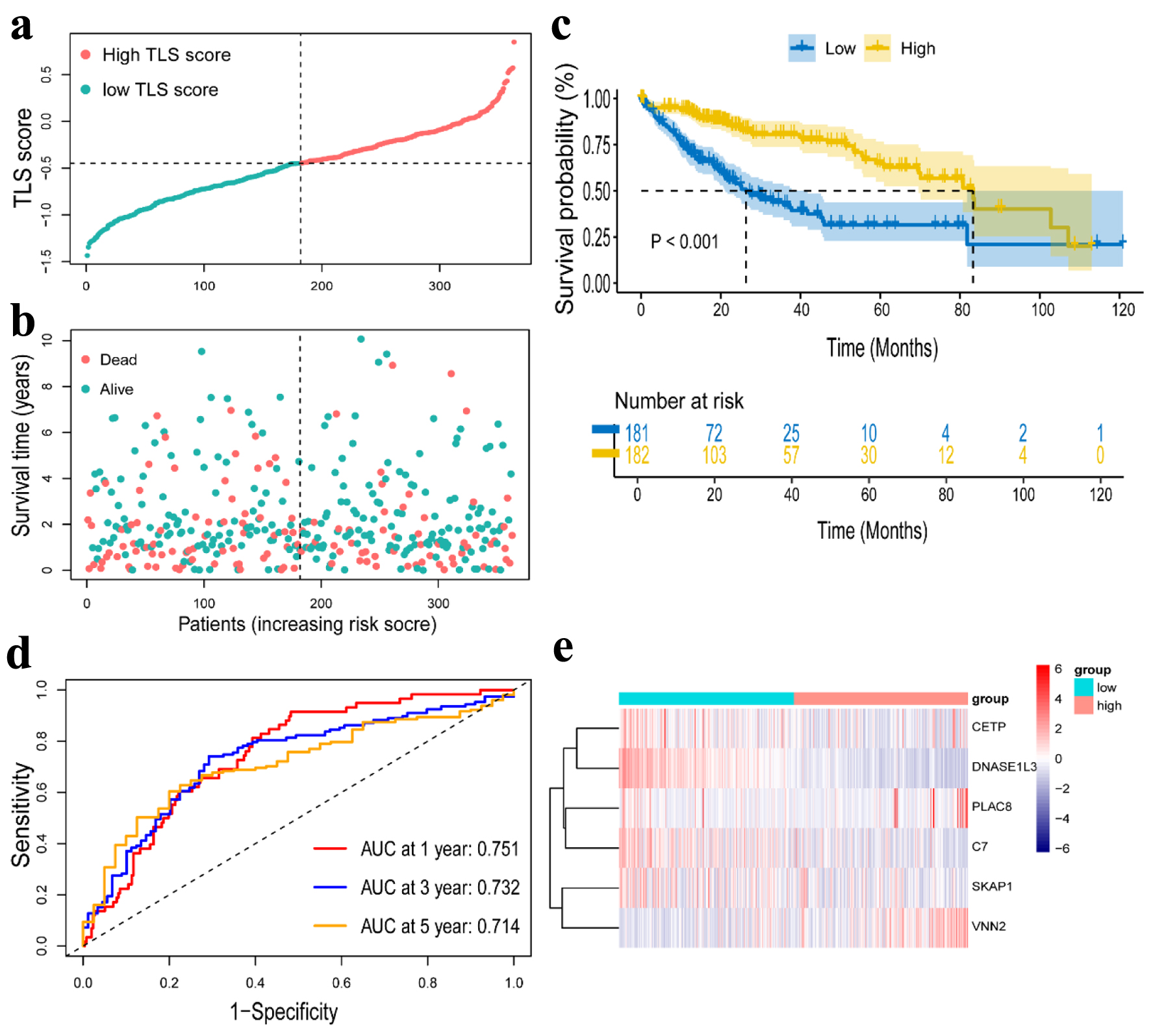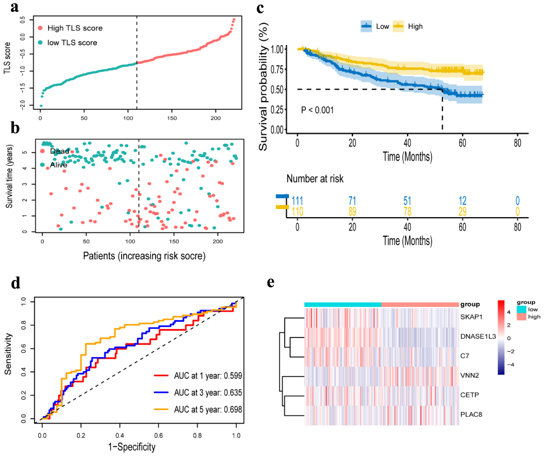 We further verified the prognosis prediction capability of the TLS signature in the GSE14520 dataset. According to the same formula used to calculate TLS score in the TCGA cohort, the dataset’s 221 patients were divided into low-TLS score (n = 110) and high-TLS score (n = 111) groups (Fig. 6a, b), and comparative investigations were conducted on these two groups. While VNN2 was substantially expressed in the high-TLS score group, CETP, DNASE1L3, PLAC8, C7, and SKAP1 were highly expressed in the low-TLS score group (Fig. 6e). The high-TLS score group had an obviously longer OS than the low-TLS score group, as shown in Figure 6c. The findings in the GEO cohort were consistent with those in the TCGA cohort. Additional time-dependent ROC analysis was performed on the dataset, and the results showed that OS’s prognosis accuracy was 0.599 at 1 year, 0.635 at 3 years, and 0.698 at 5 years (Fig. 6d). The same validation was taken in the ICGC cohort, and the OS outcome was similar to the GSE 14520 cohort and the TCGA cohort (Supplementary Material 1C, www.wjon.org). Due to the short survival time of patients in the ICGC cohort, we only present the AUC for 1, 2 and 3 years (Supplementary Material 1D, www.wjon.org).