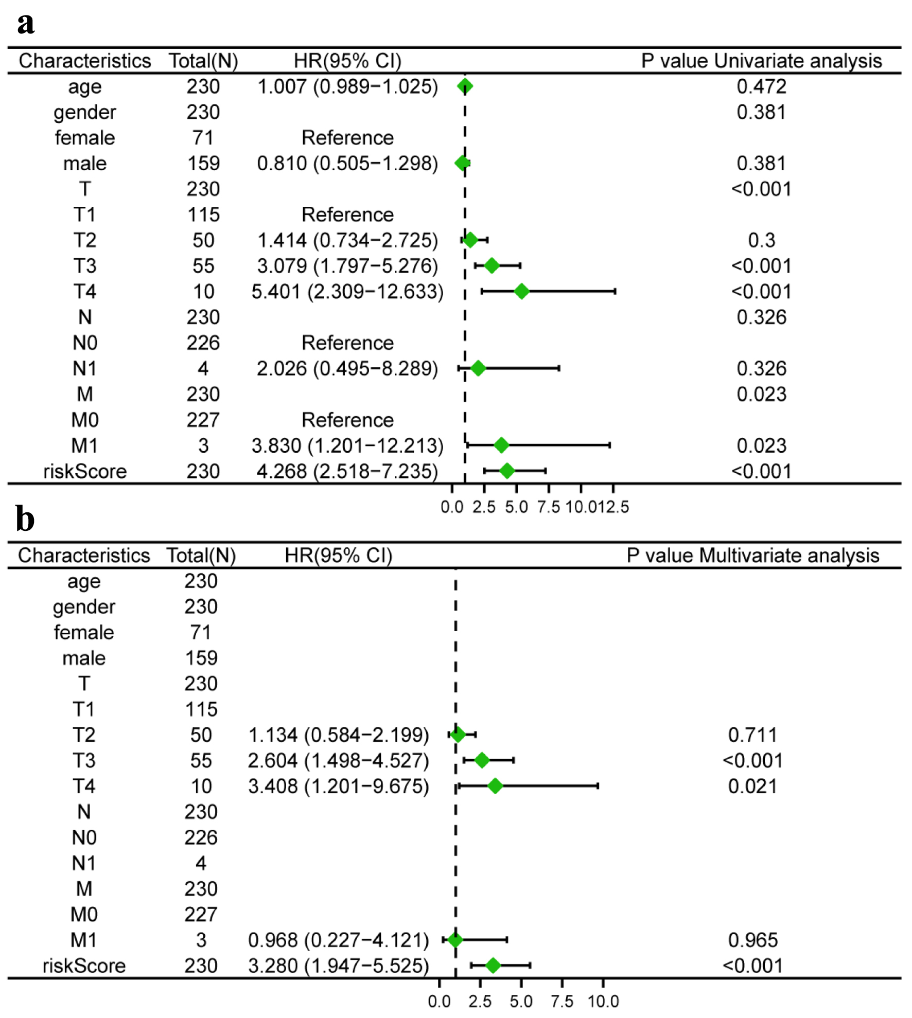 ![]() Click for large image | Figure 7. Risk model independent prognostic analysis. (a) Univariate independent prognosis Cox regression analysis of TLS score and indicated clinical characteristics. (b) Multivariate independent prognosis Cox regression analysis of TLS score and indicated clinical characteristics. TLS: tertiary lymphoid structures. |