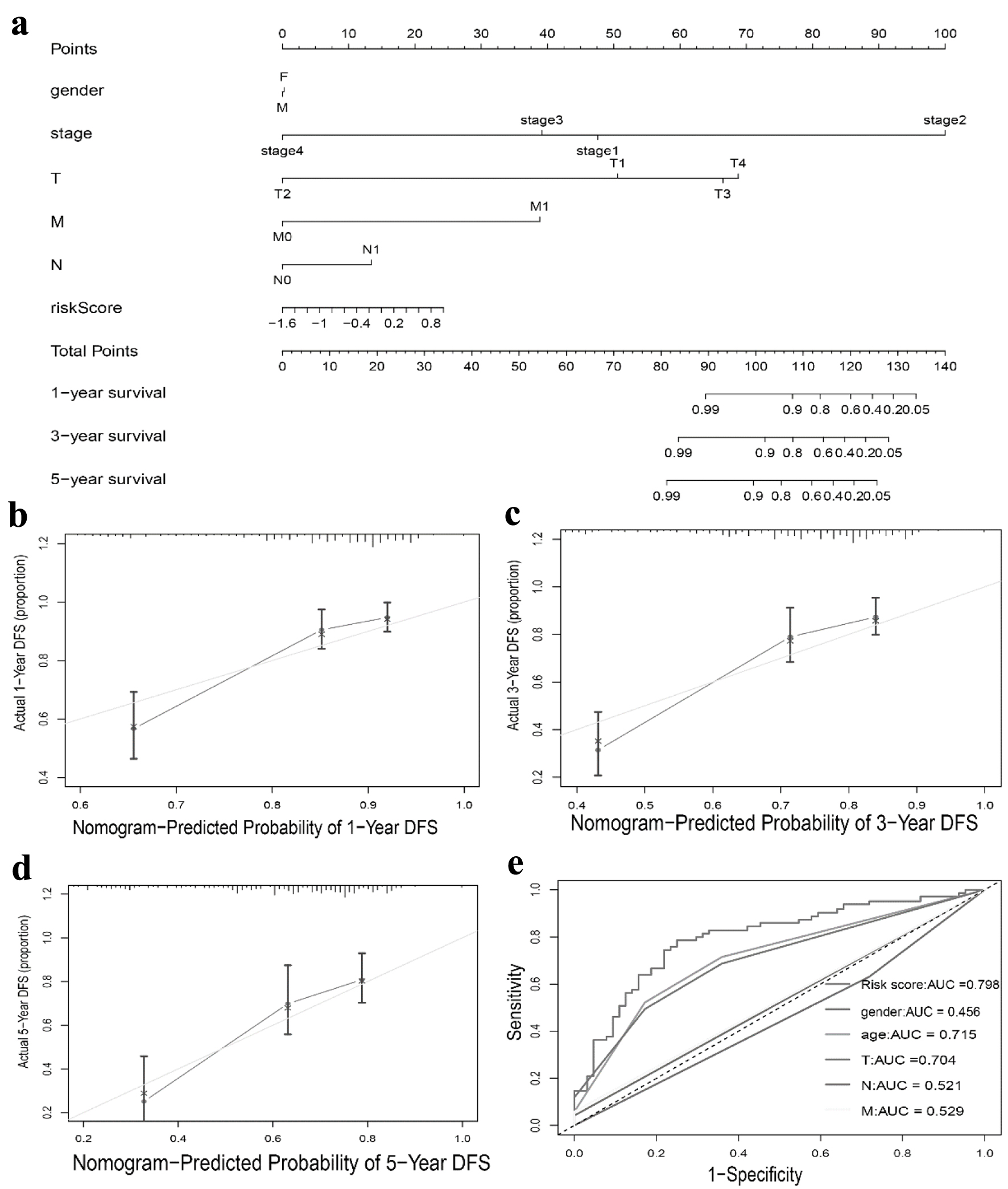 ![]() Click for large image | Figure 8. Nomogram to predict survival probability of hepatocellular carcinoma patients. (a) Nomogram combining TLS score with pathologic features. (b-d) Calibration plots for predicting 1 -, 3 -, 5-year OS of patients. (e) ROC curves for prediction of survival by the TLS score and other variables (age, gender, T stage, N stage, M stage). TLS: tertiary lymphoid structures. |