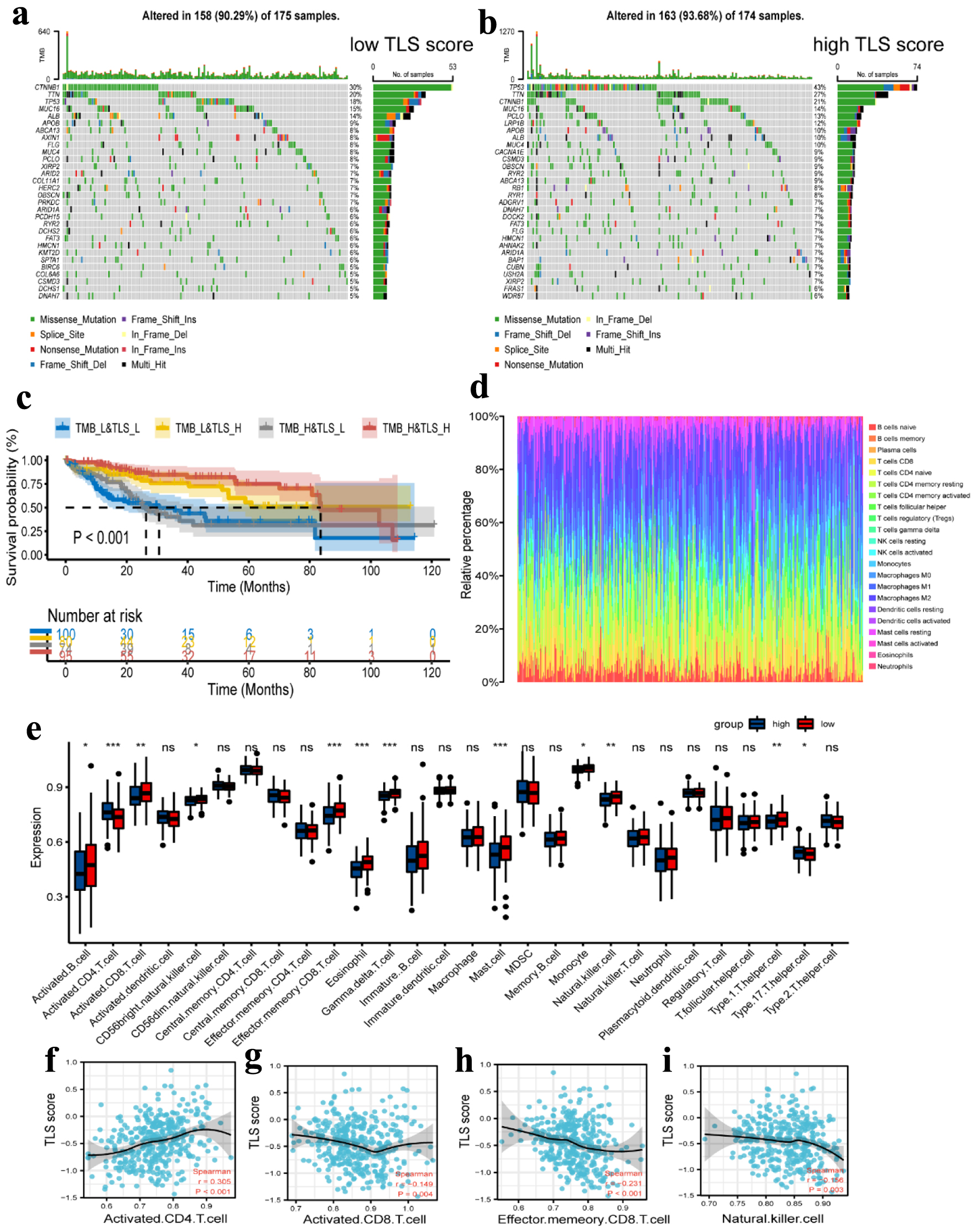 ![]() Click for large image | Figure 9. Tumor mutation analysis and immune cell infiltration analysis. (a, b) Waterfall plots of the mutated genes in the HCC patients from low TLS score (a) and high TLS score (b) subgroups. The mutation types of genes were marked by different colors. (c) Kaplan Meier curves showing the overall survival of patients in the TMB_L&TLS_L, TMB_L&TLS_H, TMB_H&TLS_L, and TMB_H&TLS_H groups. (d) Relative proportion of immune cell infiltration in high TLS score and low TLS score group. (e) Different expression of immune cell infiltration in high TLS score and low TLS score group. Red represents the high TLS score group. Blue represents the low TLS score group. (f-i) Correlation between activated CD4 T cell (f), activated CD8 T cell (g), effector memory CD8 T cell (h), and natural killer cell (i) and TLS score in HCC. TLS: tertiary lymphoid structures. |