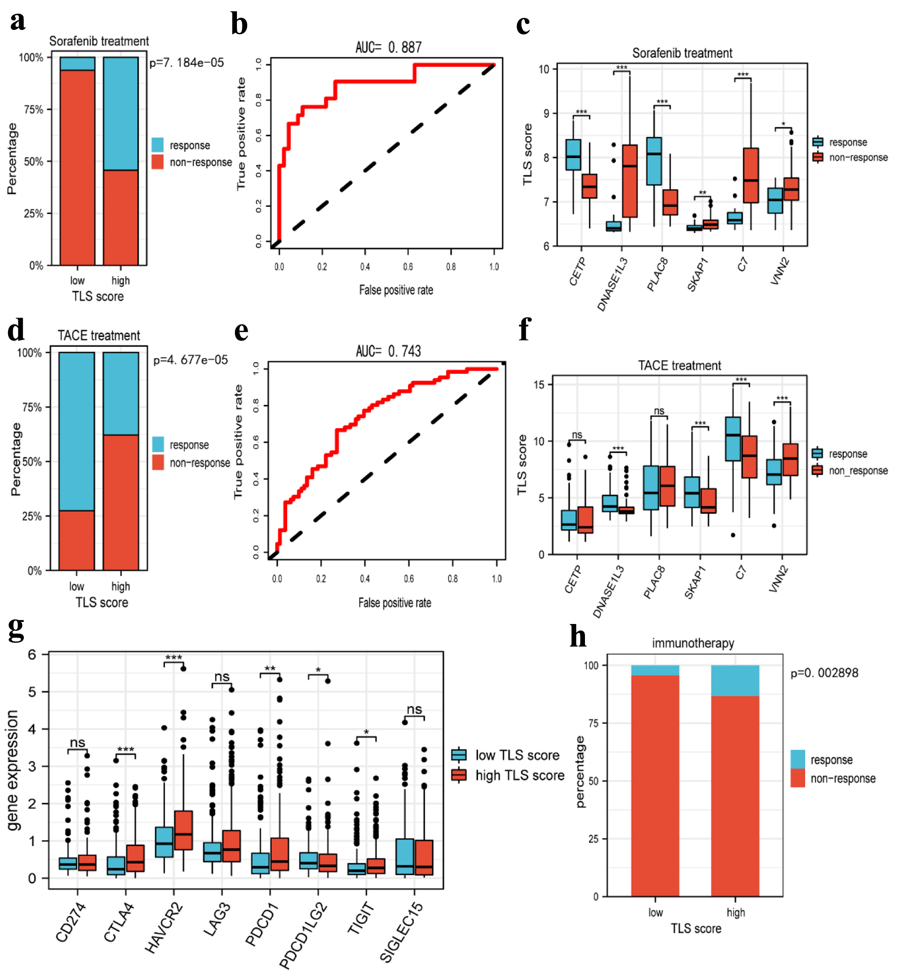 The response of HCC patients to sorafenib and TACE therapy regimens was assessed in the GSE109211 and GSE104580 cohorts using ROC curves and AUC. The sensitivity to immunotherapy in the patients with low and high TLS scores was assessed using the Tumor Immune Dysfunction Exclusion (TIDE) website [19].