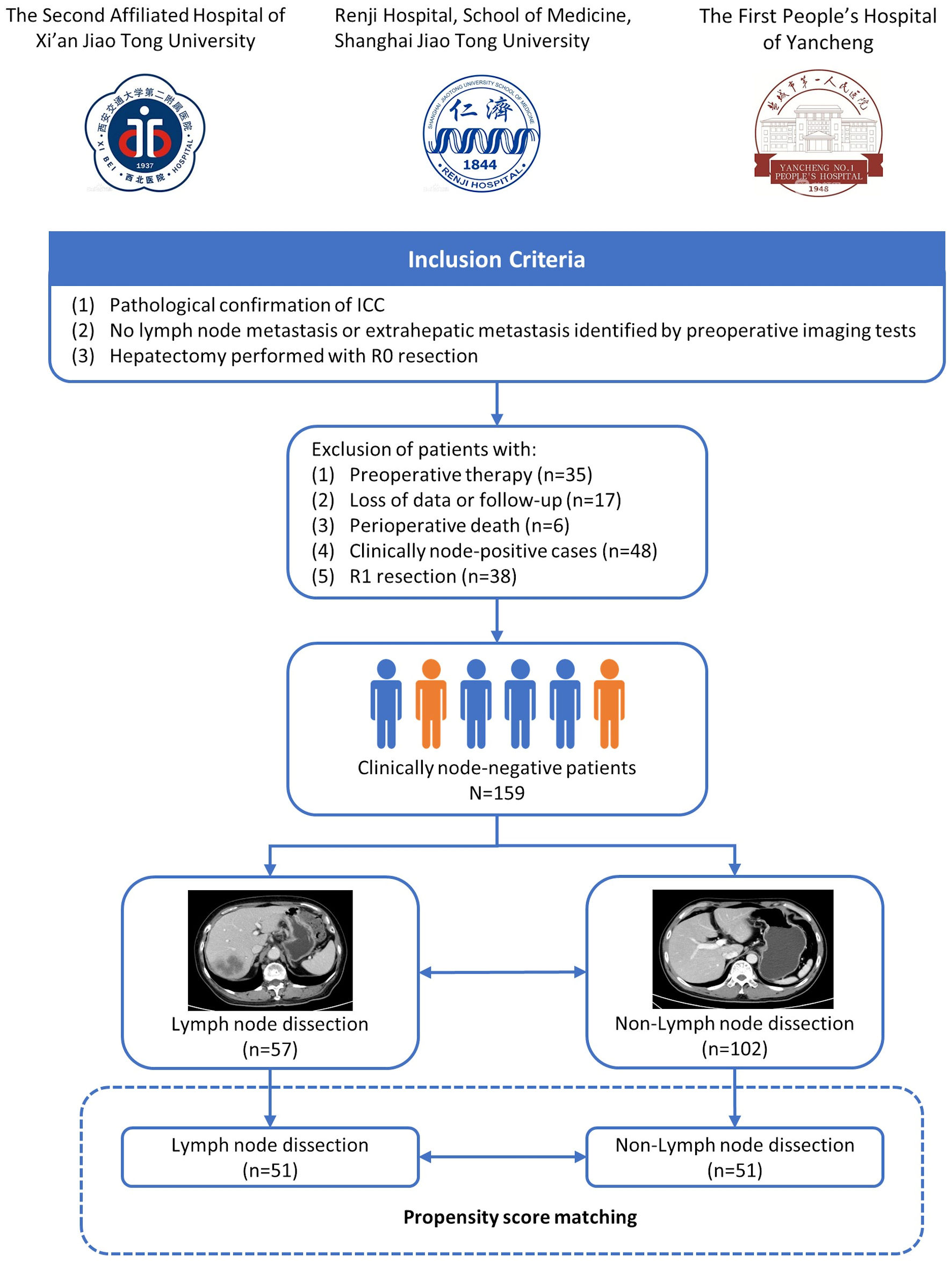 Initially, 303 patients who underwent curative-intent resection for ICC between January 2007 and December 2019 were screened for the study. Fifty-eight patients were excluded due to preoperative therapy (n = 35), loss of data or follow-up (n = 17) and perioperative death (n = 6) based on the study criteria. Of the remaining patients, 48 patients with clinically positive nodes and 38 patients who underwent R1 resection did not meet the selection criteria. Finally, a total of 159 patients with clinically node-negative ICC were enrolled in the present study.