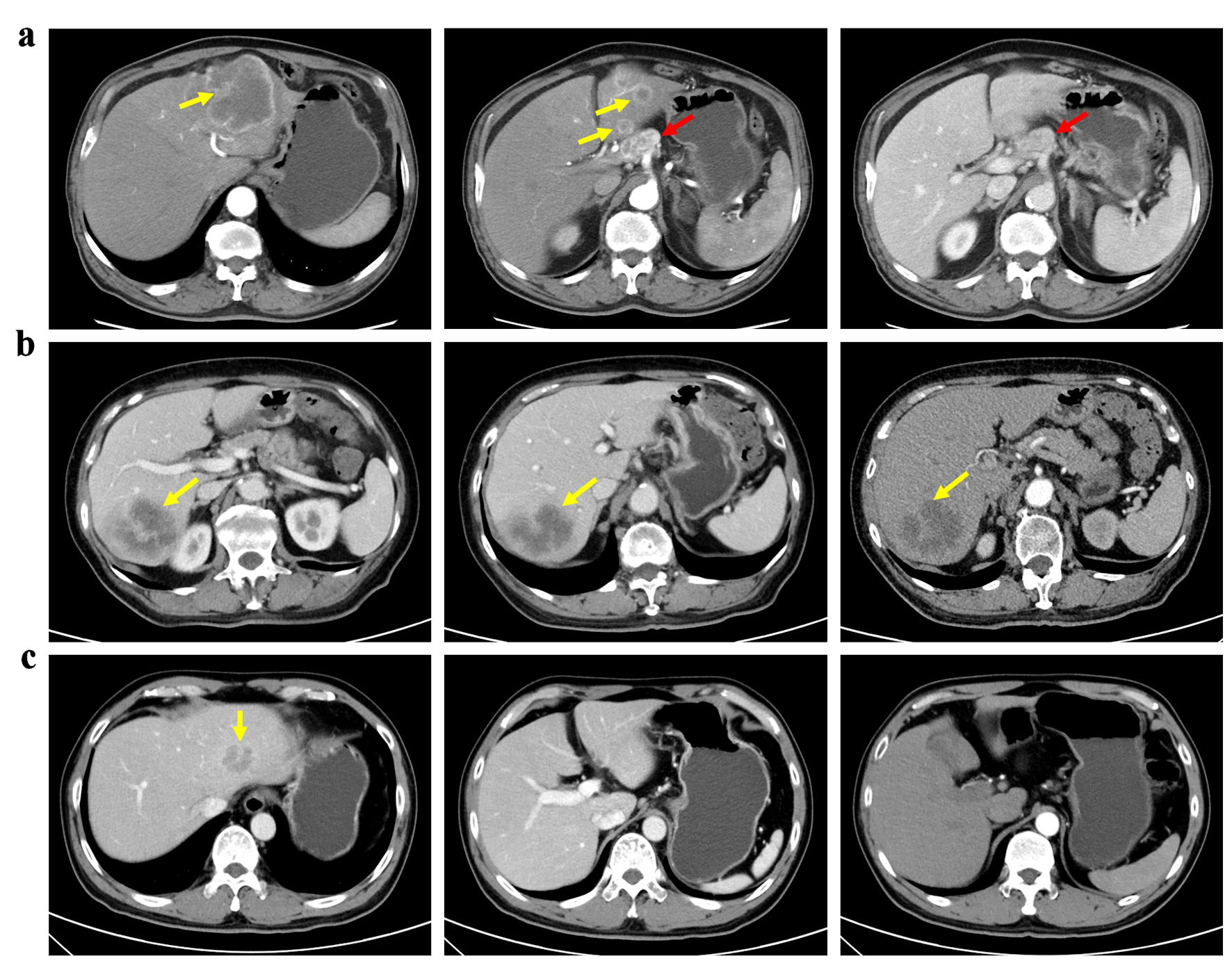 ![]() Click for large image | Figure 2. Patients with different lymph node status of ICC. (a) A patient with clinically node-positive ICC received left hemi-hepatectomy and lymph node dissection. (b) A patient with clinically node-negative ICC underwent both liver resection and lymph node dissection based on suspicion of lymph node metastasis at multidisciplinary team discussion. Postoperative pathology confirmed no lymph node metastasis. (c) A patient with clinically node-negative ICC underwent liver resection only. Yellow arrows: tumor; red arrows: lymph node. |