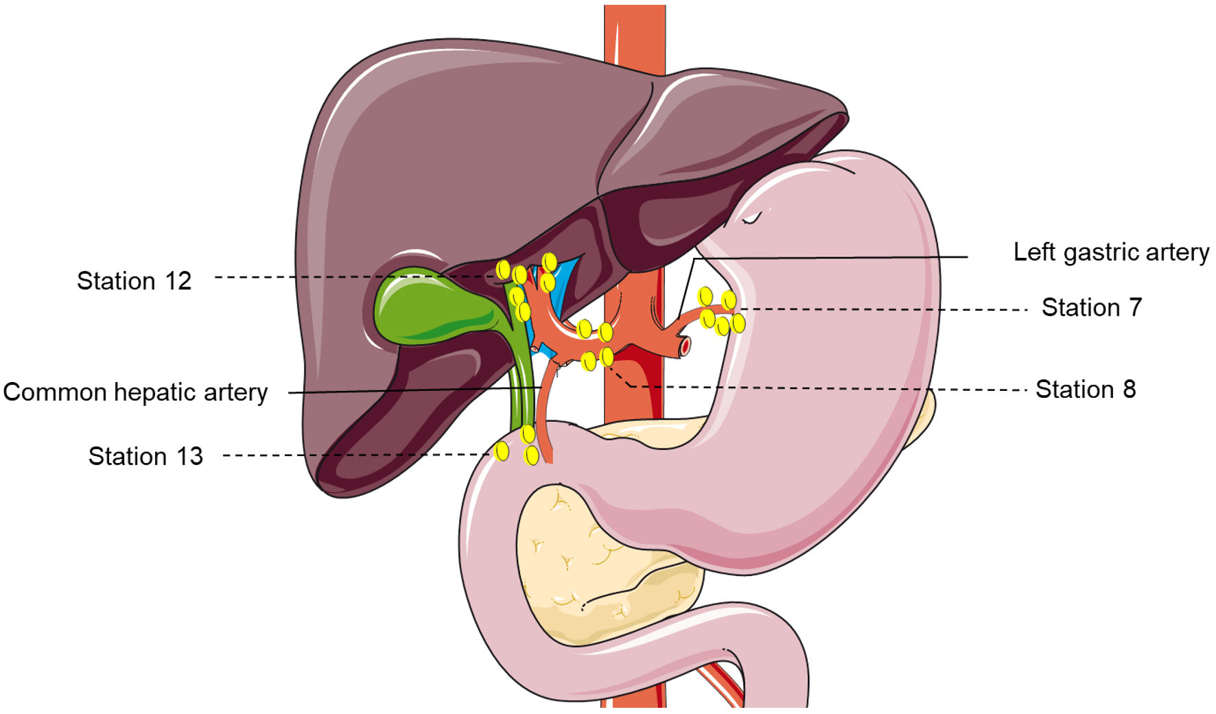 The operative strategies were determined by senior surgeons on the basis of patients’ clinical conditions including size, number and location of tumor, vascular involvement, liver function reserve and volume of residual liver. LND was performed when: 1) Patients were suspicious of LNM at a weekly multidisciplinary team discussion before operation; or 2) Enlarged lymph nodes were detected during surgical findings. The extent of LND in the present study included: 1) Lymph nodes located around the hepatoduodenal ligament and the common hepatic artery (station 12 and 8); 2) Retro-pancreatic lymph nodes (station 13, for right-sided tumors); and 3) Lymph nodes around the cardiac portion of the stomach and along the lesser curvature (station 7, for left-sided tumors) (Fig. 3).