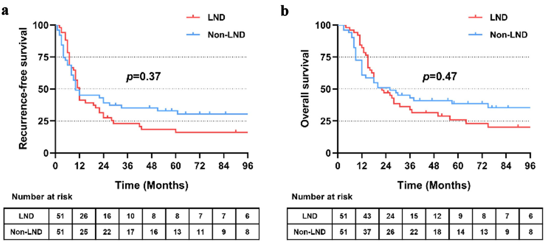 In the crude cohort, median RFS was similar between the LND group and non-LND group (12.0 vs. 10.0 months, P = 0.37) (Fig. 4a). For median OS, it was slightly shorter in the LND group than that in the non-LND group with no significant difference (22.0 vs. 26.0 months, P = 0.47) (Fig. 4b). The 1-, 3- and 5-year survival rates in the two groups were 82.4% vs. 60.8%, 33.9% vs. 43.0% and 26% vs. 38.6%, respectively.