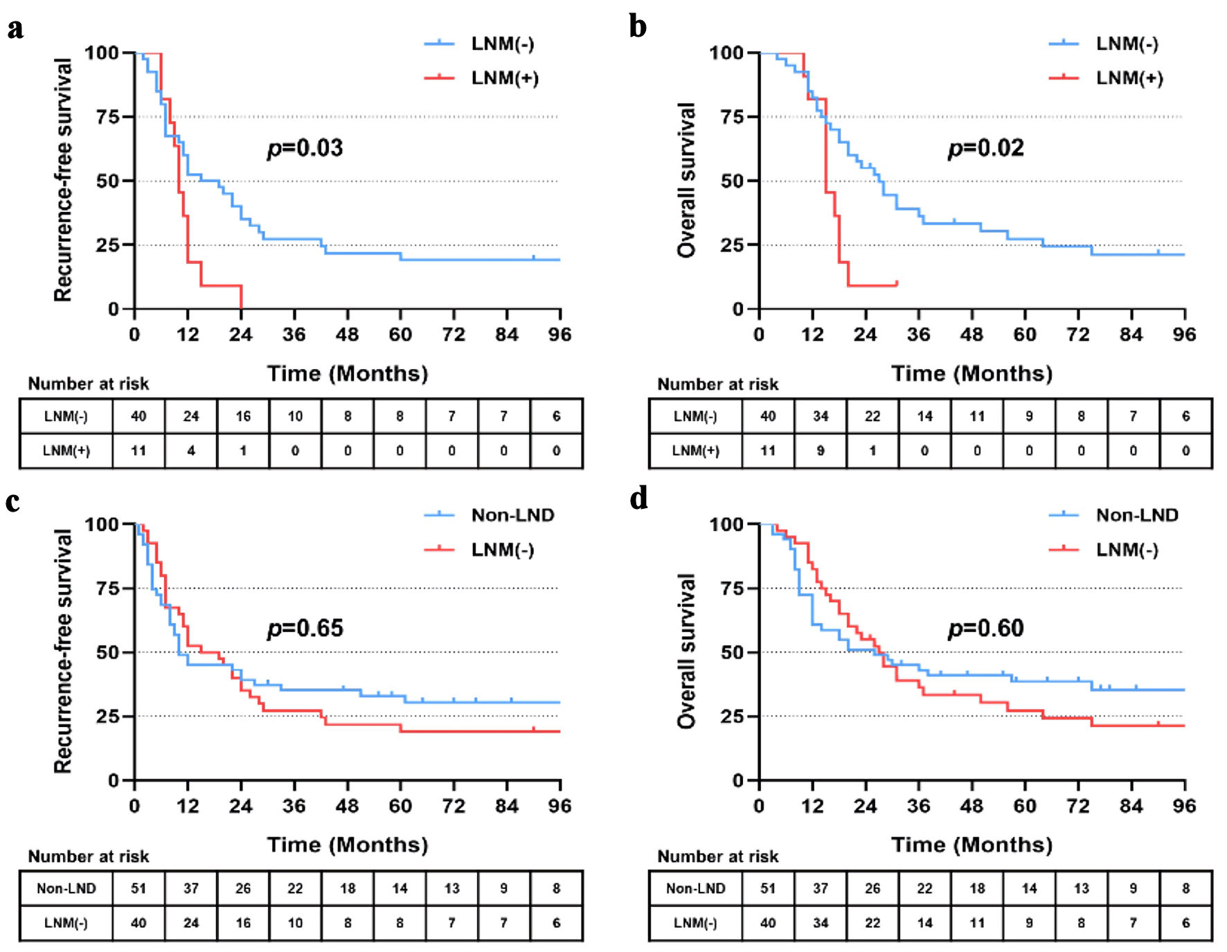 Among 51 patients who received LND, 11 patients presented with positive lymph nodes (LNM (+)) and 40 patients presented with LNM (-) confirmed by pathological findings. The presence of LNM significantly affected RFS and OS. Patients with LNM (-) showed significantly better outcomes than those with LNM (+), with a median RFS of 17.0 vs. 10.0 months (P = 0.03) and a median OS of 27.0 vs. 15.0 months (P = 0.02) (Fig. 5a, b). Of note, no significant difference of RFS or OS was observed between patients with non-LND and LNM (-) (P = 0.65 and 0.60, respectively) (Fig. 5c, d).