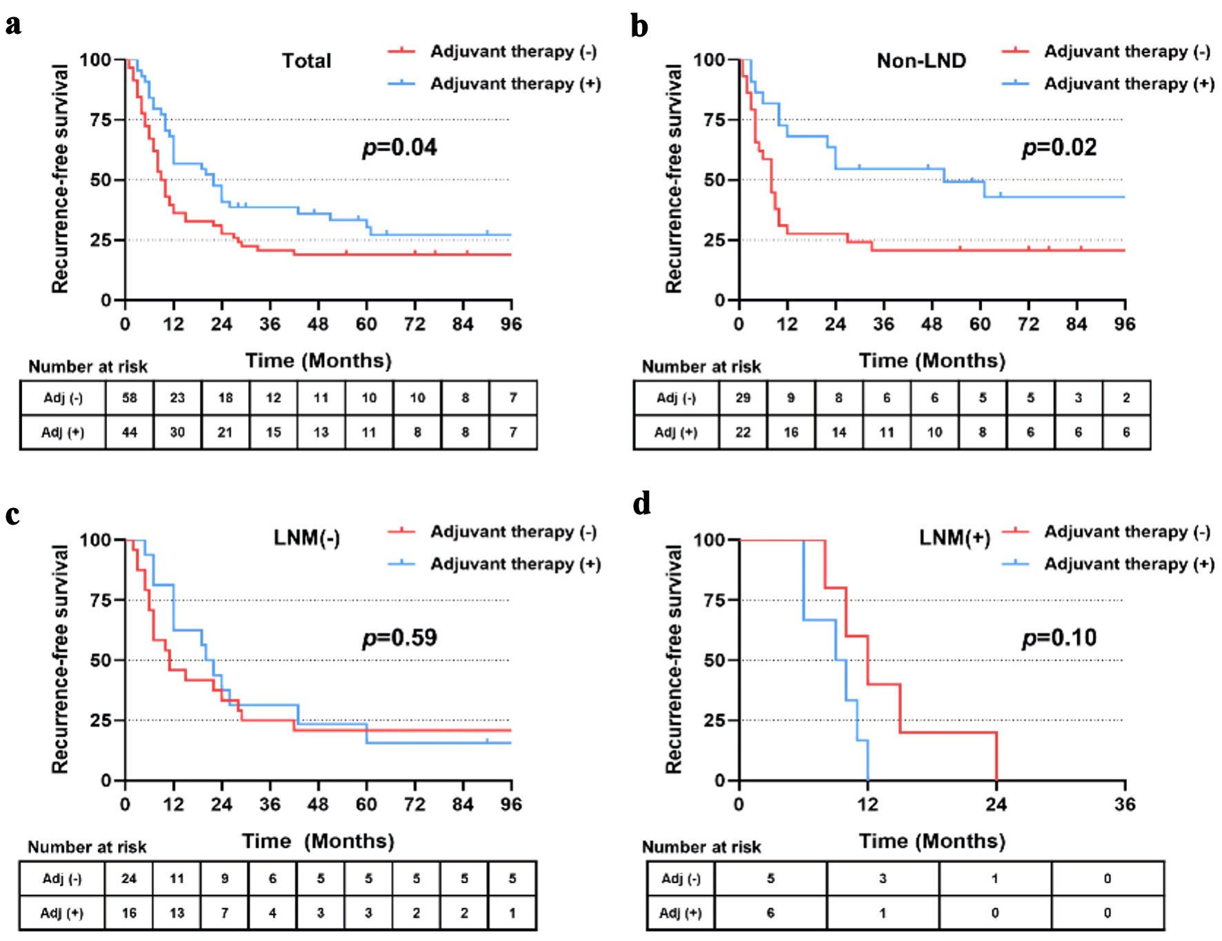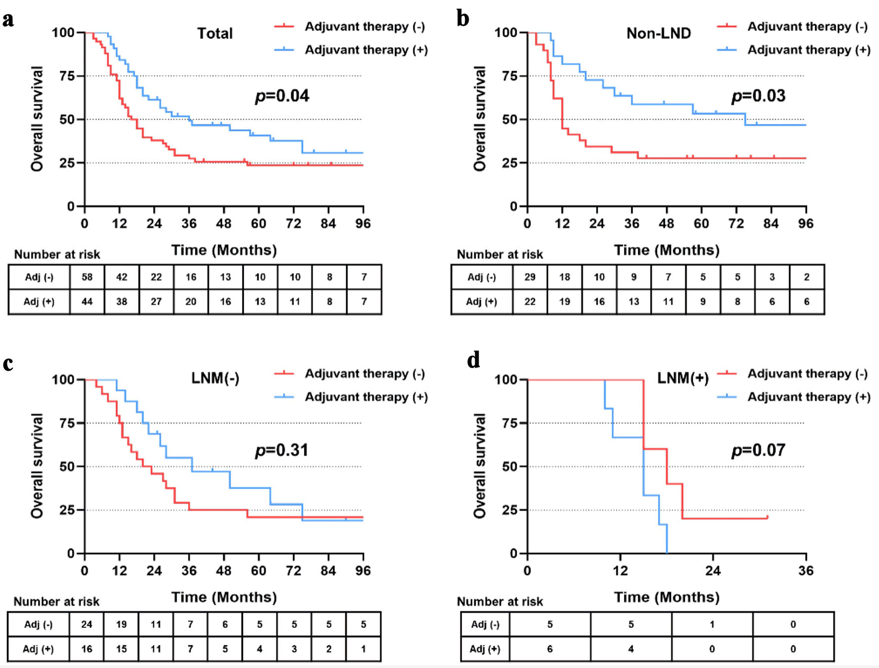 In the matched cohort, 44 patients received postoperative adjuvant therapy, including 22 patients in the non-LND group, 16 patients in the LNM (-) group and six patients in the LNM (+) group. Patients who received adjuvant therapy showed significantly longer RFS (22.0 vs. 9.5 months, P = 0.04) and OS (36.0 vs. 17.0 months, P = 0.04) than those without adjuvant therapy (Figs. 6a, 7a). Further stratified analysis found that patients in the subgroup of non-LND benefited most from postoperative therapy (P = 0.02 for RFS, and P = 0.03 for OS) (Figs. 6b, 7b). However, no significant benefits of RFS or OS were observed by postoperative treatment in the subgroups of LNM (-) and LNM (+) (all P > 0.05) (Figs. 6c, d and 7c, d).