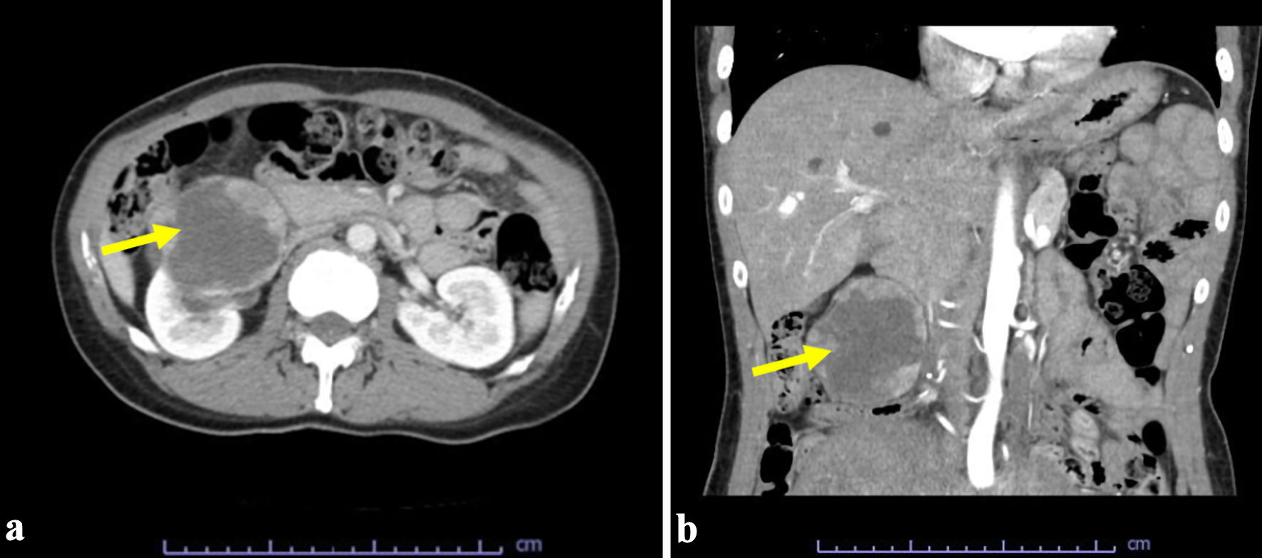 ![]() Click for large image | Figure 1. Computed tomography scan revealed a tumor (arrows) in the lower pole of the right kidney: (a) axial and (b) coronal view. |
