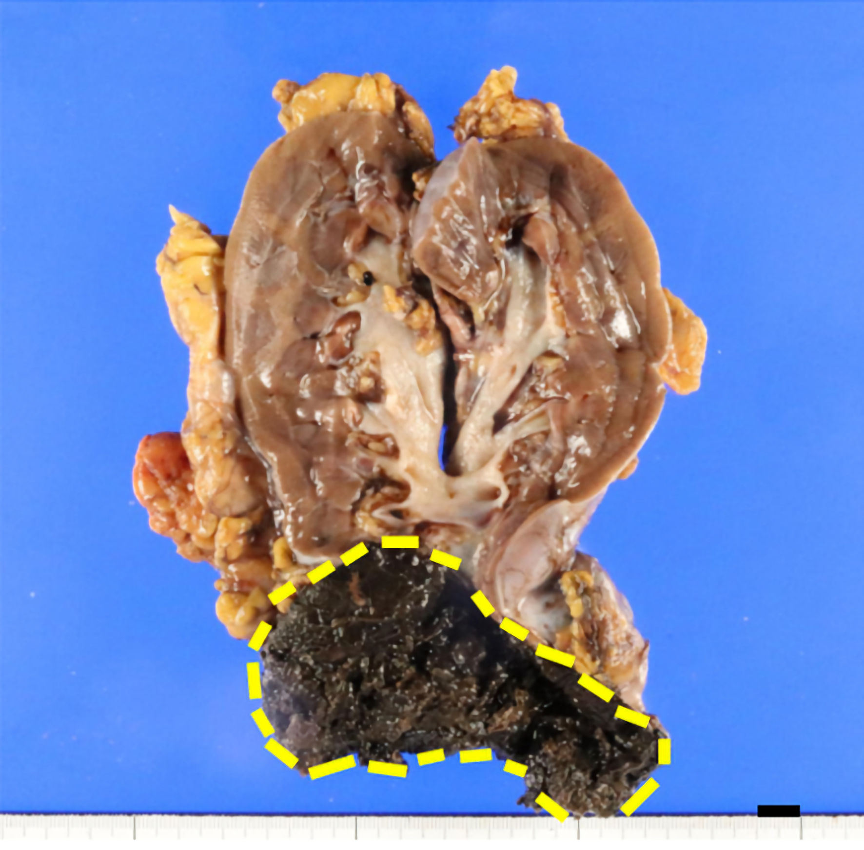 ![]() Click for large image | Figure 2. Grossly, the cut surface of the tumor (7 cm in diameter), surrounded by a dashed line, was dark brown in color. The distance between the tumor and the renal pelvis is 1 cm (scale bar (black): 10 mm). |