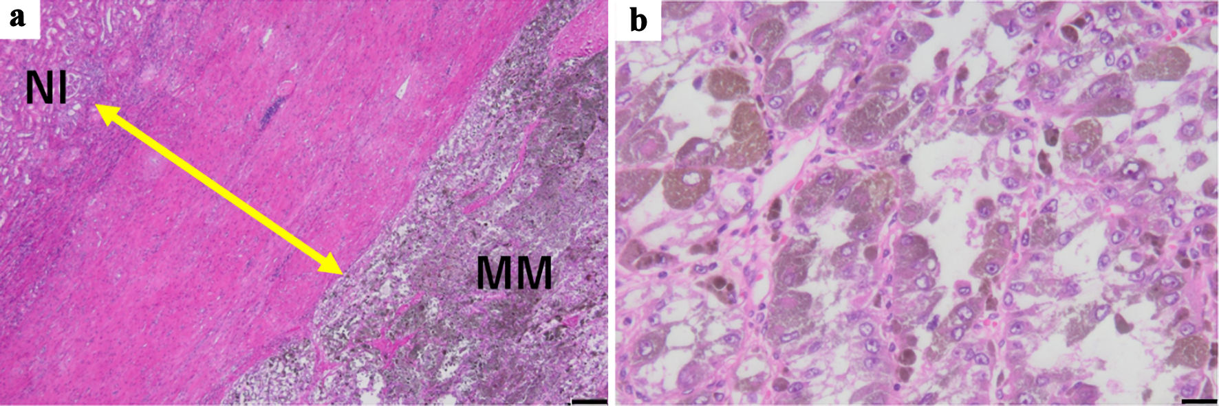 ![]() Click for large image | Figure 3. (a) Histologically, a tumor was demarcated by the thick fibrous capsule (double-headed arrow) (hematoxylin and eosin stain, scale bar: 200 µm, original magnification: × 40). (b) The tumor cells with large nucleoli and abundant melanin granules in acidophilic cytoplasm showed papillary, solid, and/or alveolar growth patterns (hematoxylin and eosin stain, scale bar: 20 µm, original magnification: × 400). MM: malignant melanoma; Nl: normal renal tissue. |