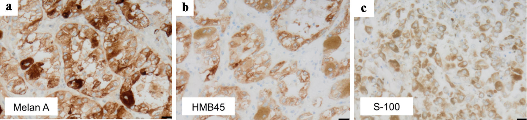 ![]() Click for large image | Figure 4. Immunohistochemical examination indicated positivity for (a) Melan A, (b) HMB45, and (c) S-100 in the tumor cells (scale bar: 20 µm, original magnifications: × 400). HMB45: human melanoma black 45; S-100: soluble 100 protein. |