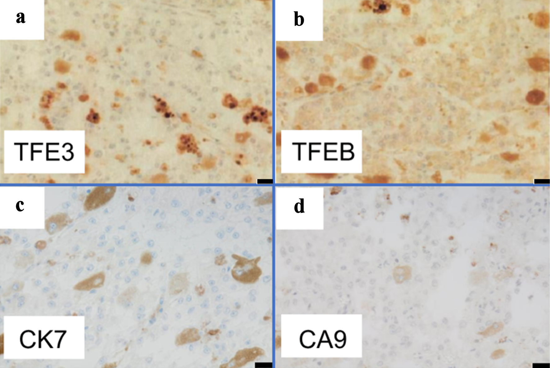 Grossly, a tumor (7 cm in diameter) in the right kidney had a dark-brown split, suggesting degeneration and necrosis of the tumor (Fig. 2). Histologically, the tumor was well demarcated by a thickened fibrous capsule (Fig. 3a). Papillary growth of tumor cells with spongiotic or eosinophilic cytoplasm and prominent nucleoli was observed. They possessed a dark-brown pigment in their cytoplasm (Fig. 3b). There was no evidence of vascular or lymphatic invasion. Immunohistochemistry revealed that the tumor cells were positive for Melan A (Fig. 4a), human melanoma black 45 (HMB45) (Fig. 4b), and soluble 100 protein (S-100) (Fig. 4c) but negative for transcription factor E3 (TFE3) (Fig. 5a), transcription factor EB (TFEB) (Fig. 5b), cytokeratin 7 (CK7) (Fig. 5c), carbonic anhydrase 9 (CA9) (Fig. 5d), and AE1/AE3.