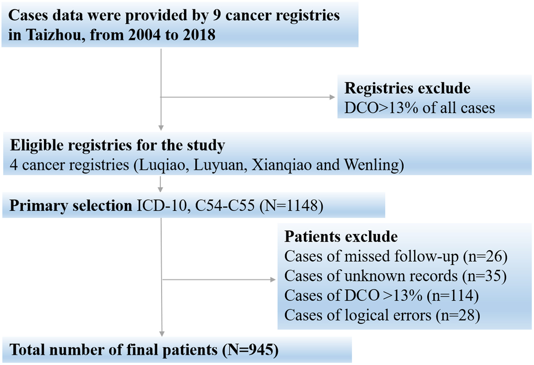 While data on patients diagnosed with endometrial cancer were provided by nine cancer registries in Taizhou, data from four of those registries (Luqiao, Yuhuan, Xianju, Wenling) were selected for further analyses based on the criterion of “death certificate only (DCO)” cases less than 13%, covering a total population of 2.6 million. Cases coded as C54-C55 were identified as endometrial cancer according to the International Classification of Diseases (ICD-10) and the International Classification of Oncology (ICD-O-3).