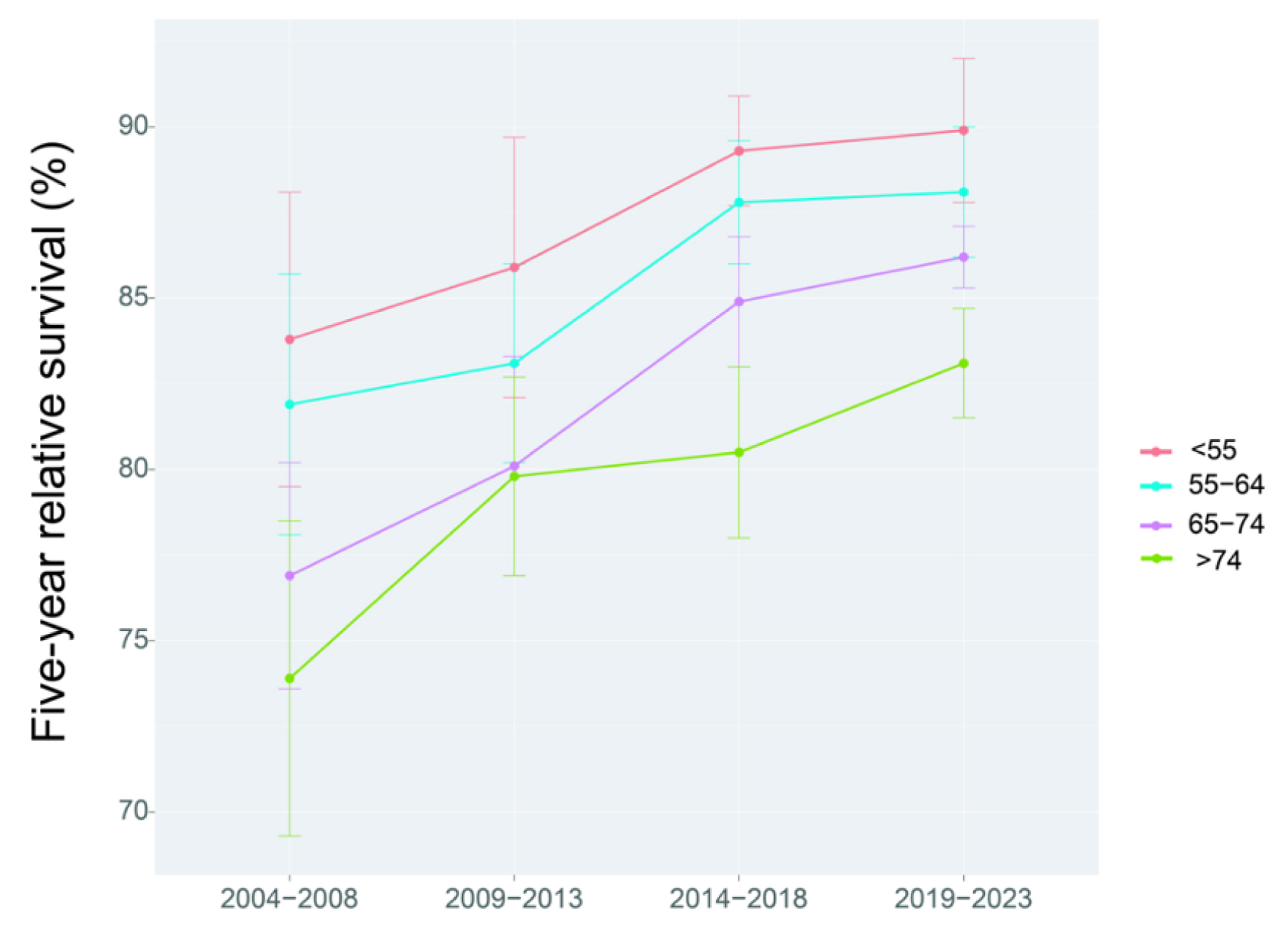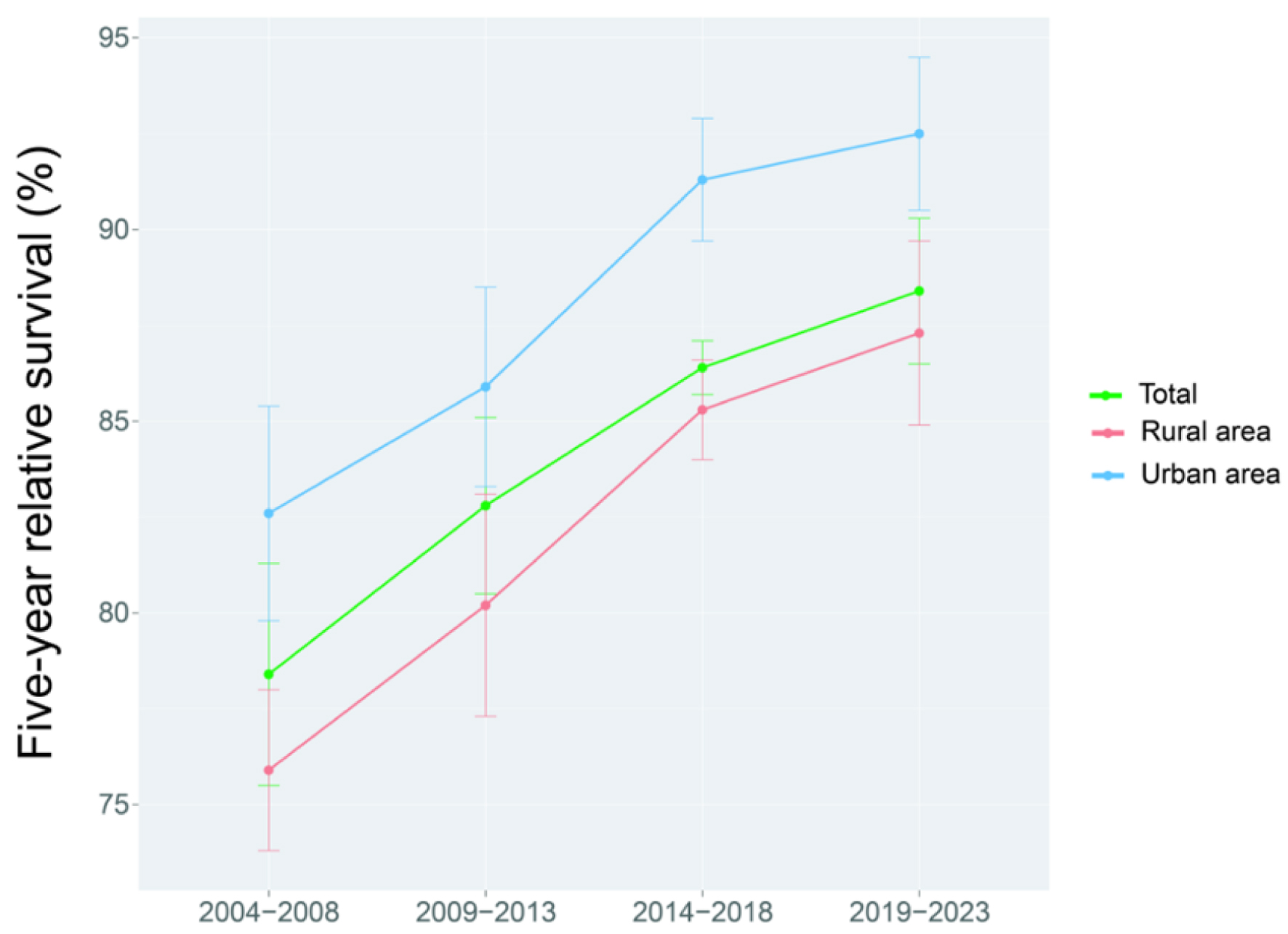 Results: We found that 5-year relative survival during 2014 - 2018 reached 86.4% for overall, while urban areas had higher survival compared to rural areas (91.3% vs. 85.3%). Furthermore, there was a clear age gradient, decreasing from 89.3% for age < 55 years to 80.5% for age > 74 years. Predicted 5-year relative survival for the upcoming period 2019 - 2023 could reach 88.4%.