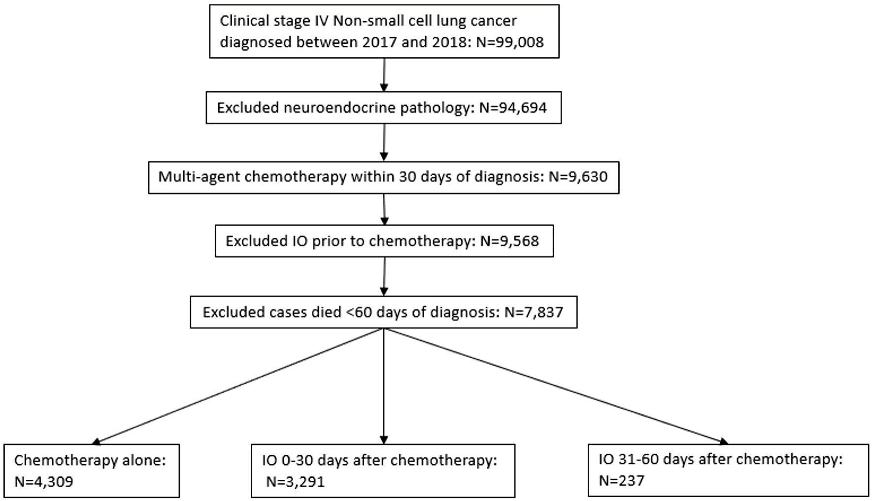 After applying initial inclusion and exclusion criteria, eligible patients were then assigned to a group of: 1) those who received early immunotherapy within 30 days of chemotherapy; 2) delayed immunotherapy within 31 - 60 days of chemotherapy; or 3) chemotherapy alone.