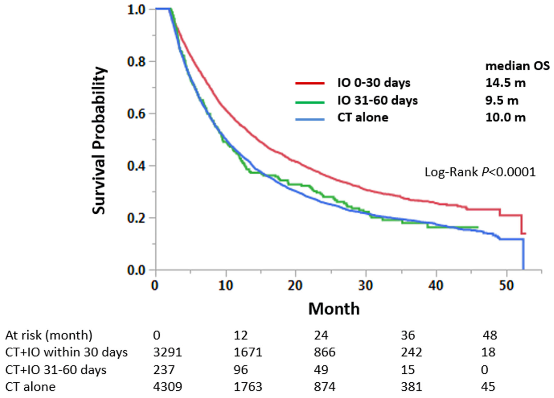 ![]() Click for large image | Figure 2. Immunotherapy within the first 30 days of chemotherapy treatment improves overall survival in patients with stage IV non-small cell lung cancer, compared to delayed or no immunotherapy statuses. Median survival months and log-rank P values are shown. CT: chemotherapy; IO: immunotherapy; OS: overall survival. |